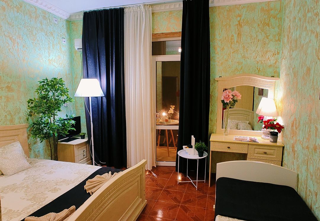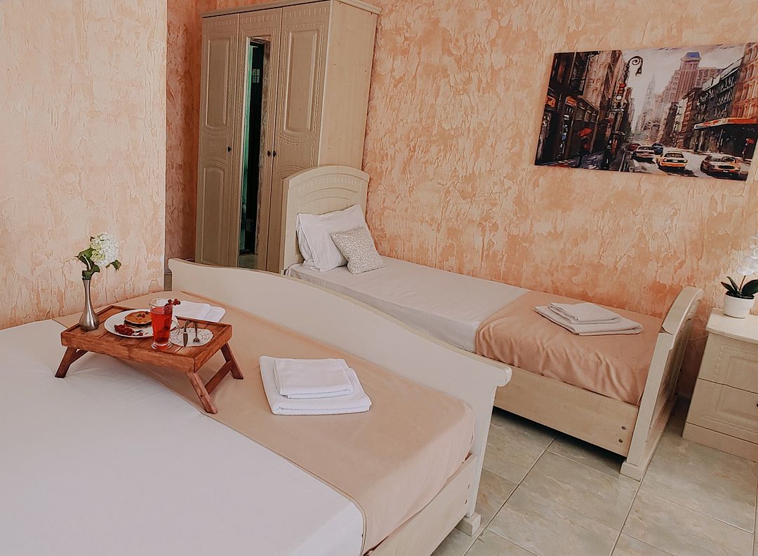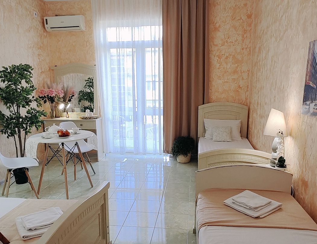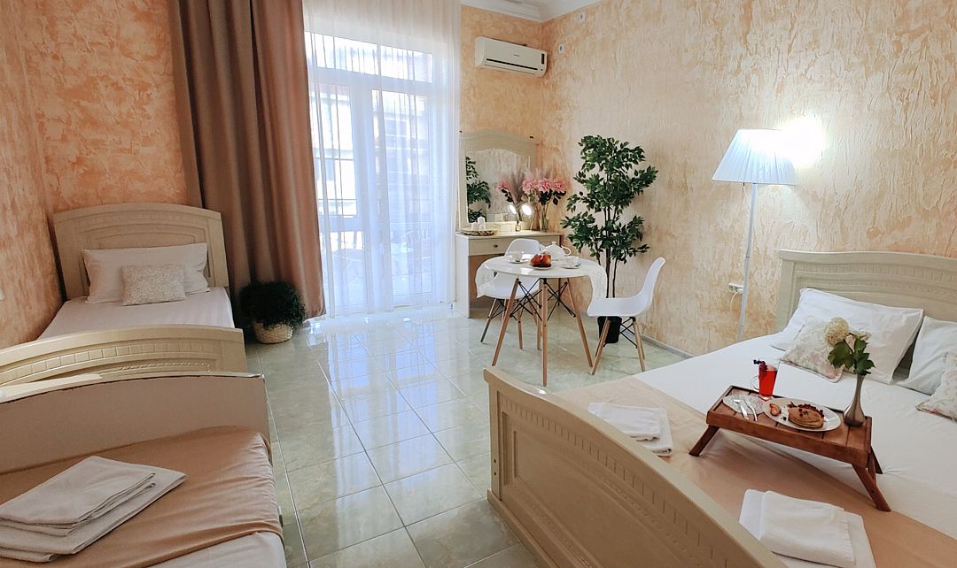 Номер оборудован: двуспальная кровать, две односпальные кровати, прикроватные тумбочки, зеркало, шкаф, туалетный столик, мини-холодильник, телевизор, кондиционер