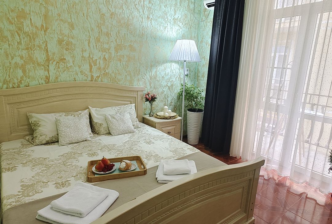 Номер оборудован: двуспальная кровать, прикроватная тумбочка, зеркало, шкаф, туалетный столик, мини-холодильник, телевизор, кондиционер