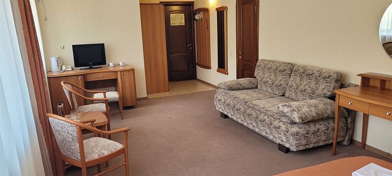 Двухкомнатный номер общей площадью 27 кв.м. В гостиной: диван. В спальне: кровать 180x200 см. Балкон, санузел.