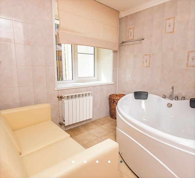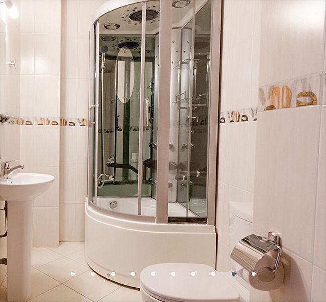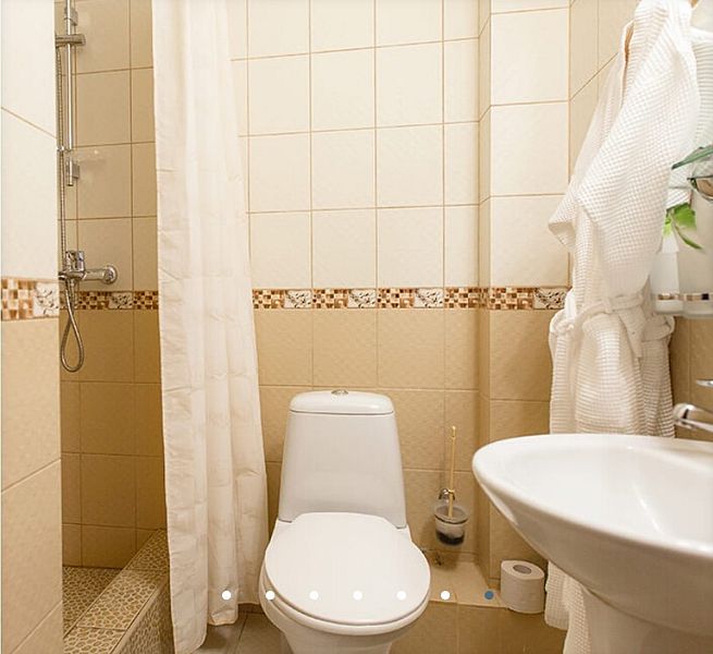 На первом этаже гостиная, ТВ, чайник, мини-бар, телефон, санузел, душевая кабина.