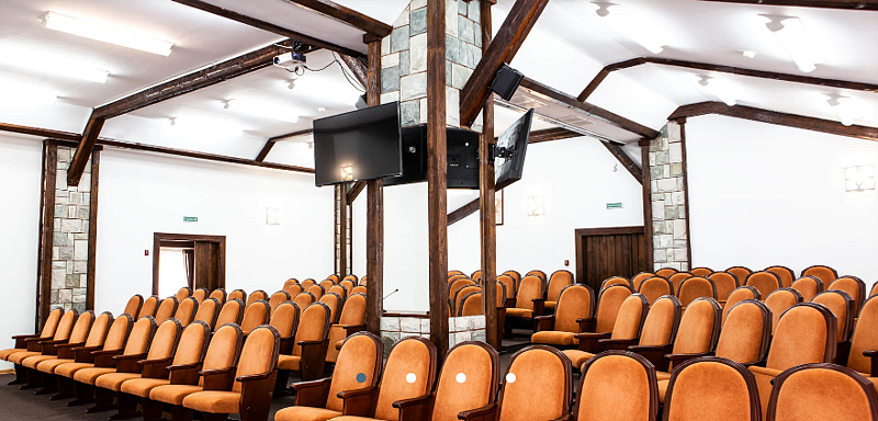 Конференц-зал: площадь 146м2, 117 посадочных мест, трибуна для докладчика.