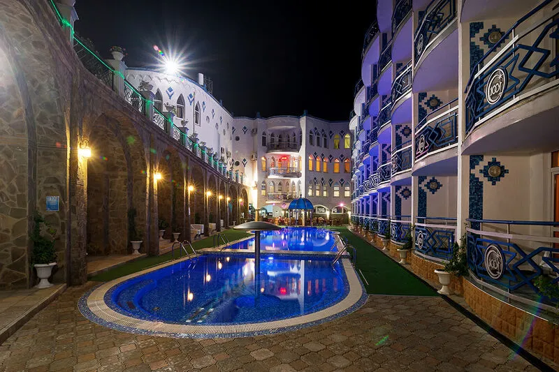 Инфраструктура отеля «1001 ночь» в Крыму расположена компактно на закрытой охраняемой территории. Отель построен в мавританском стиле. Жилой корпус 5-этажный, оборудован лифтами. Для размещения гостей предлагается 58 номеров. Все оснащены кондиционерами, телевизорами, небольшими холодильниками, санузлы с ванной, есть wi-fi. Горячая и холодная вода круглосуточно, благодаря собственной автономной газовой котельной.