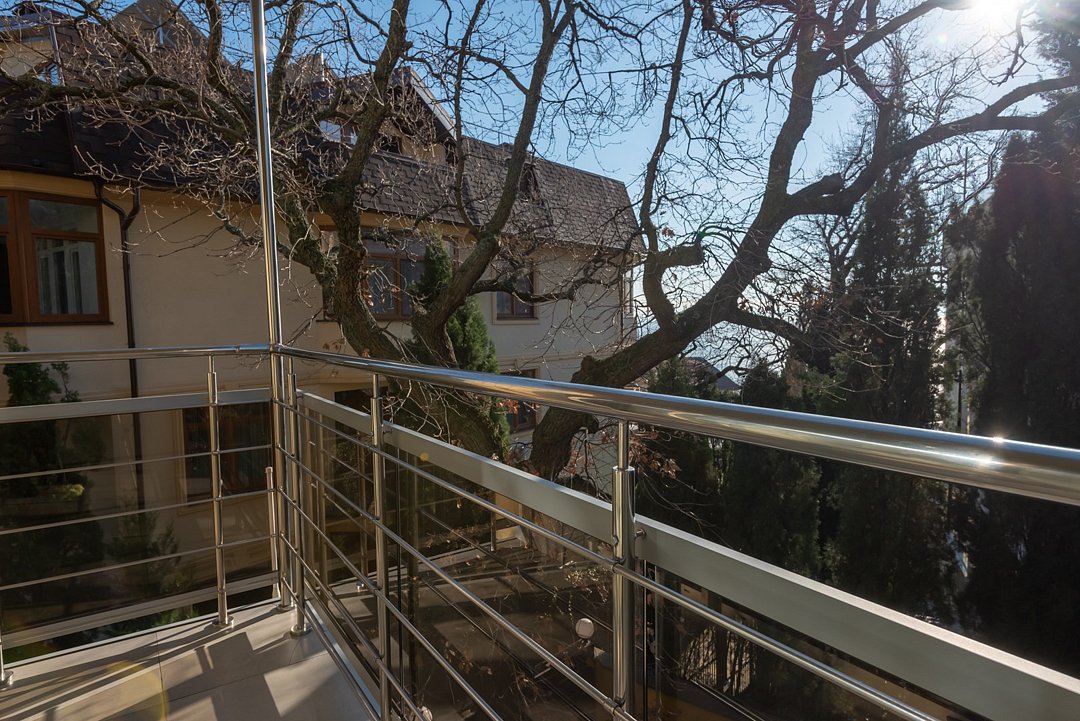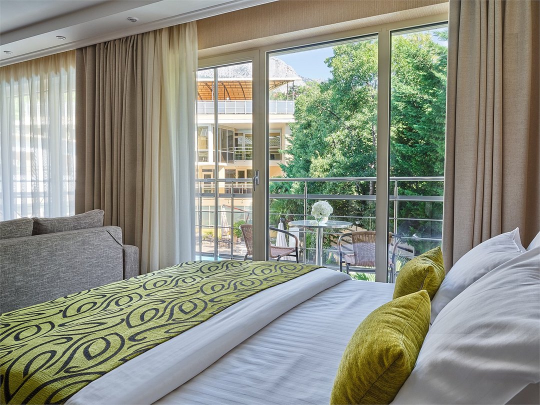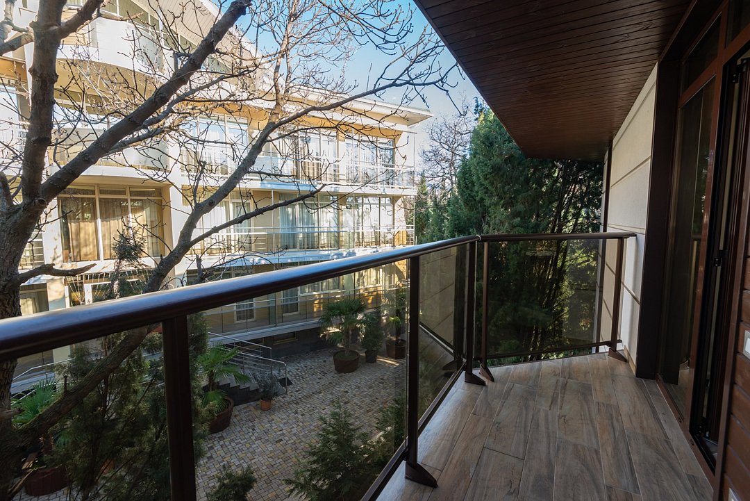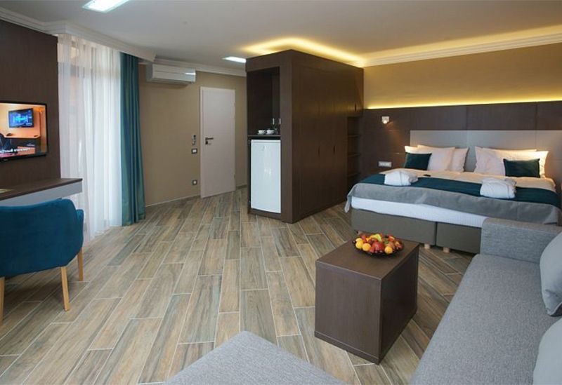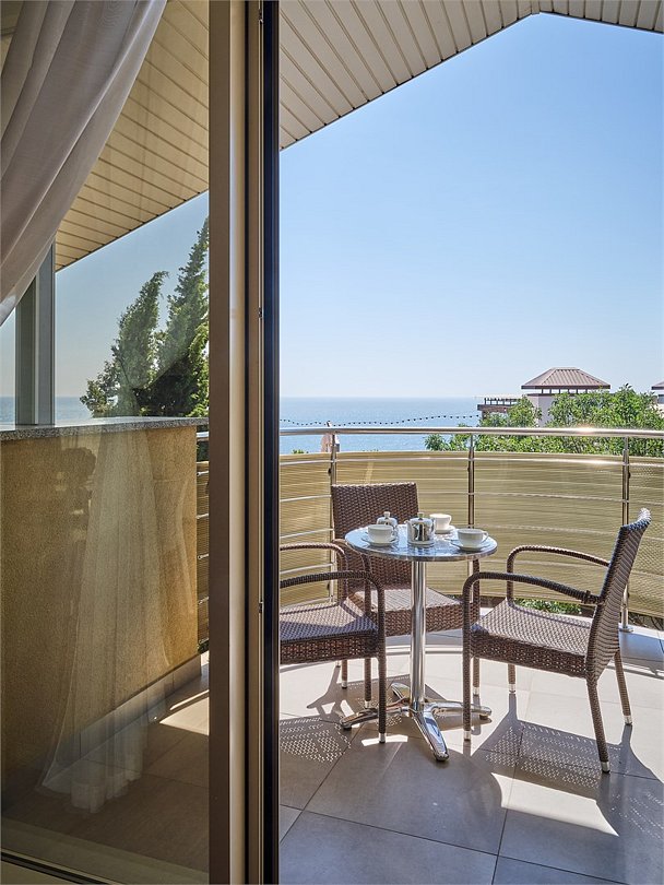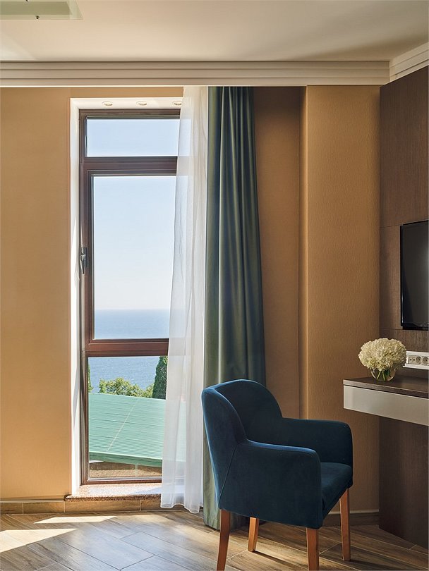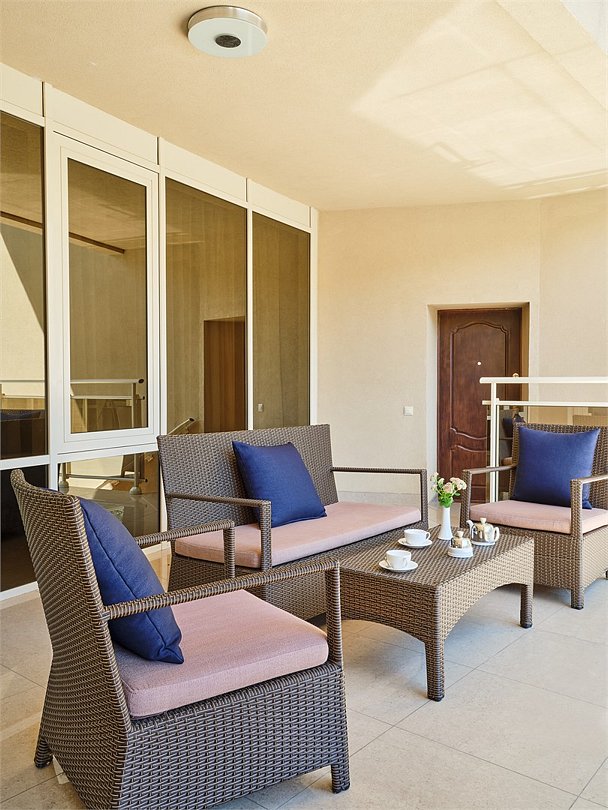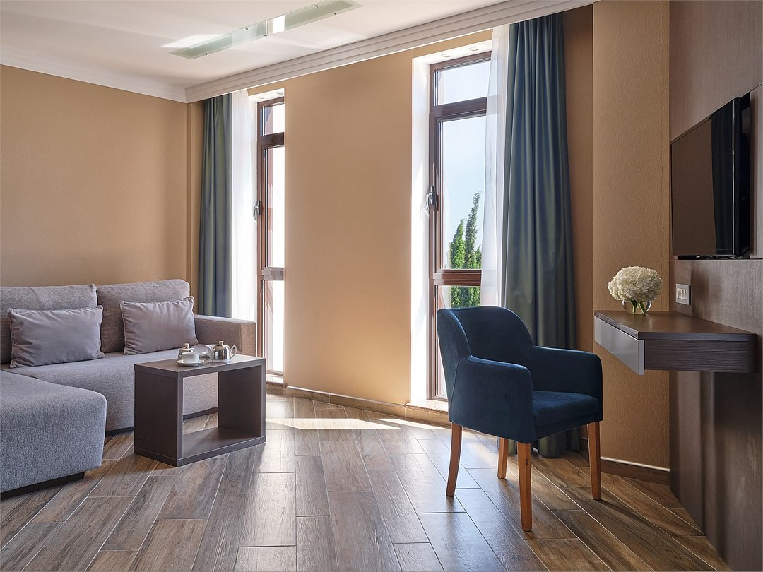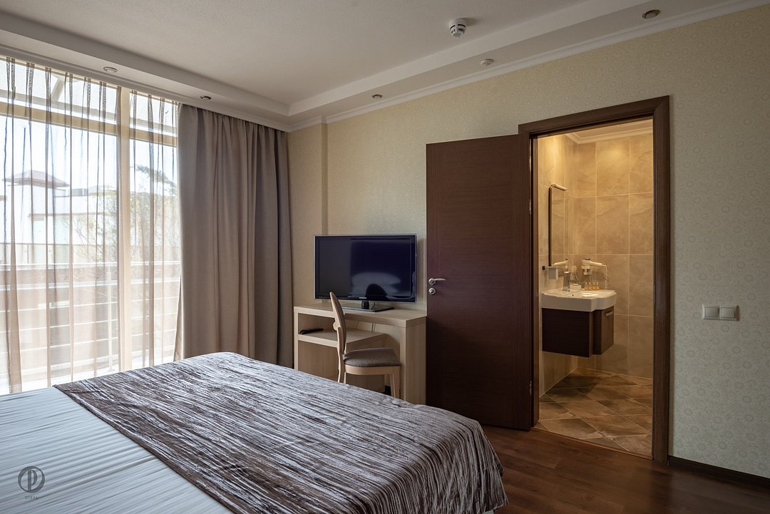 Однокомнатный номер с большой двуспальной кроватью / возможно с 2-мя раздельными — по запросу, с зоной отдыха и балконом-террасой.