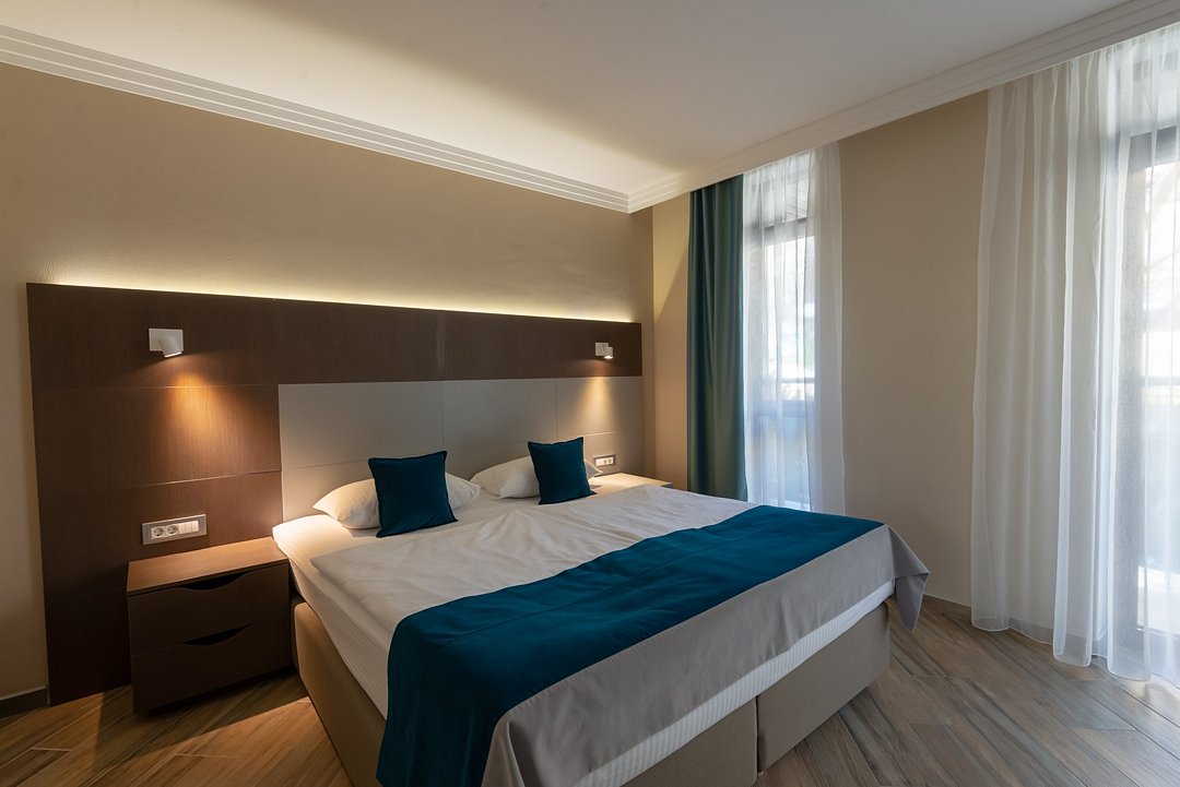 Отель очень понравился, тихий уютный, персонал отзывчивый и клиентоориентированный. Вкусно кормили, может кому то покажется меню однообразным, но нас все устраивало. Вино, фрукты, лимонад без ограничений. В номерах чисто. мебель свежая, сантехника новая. У нас был полулюкс. Дискотеки заканчивались в 22.00 и наступала тишина. Что очень радовало. Мы спали с открытыми окнами.