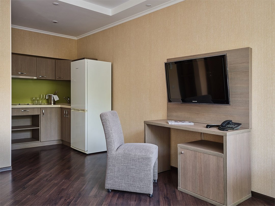 Комфортный трехкомнатный номер — 2 отдельные спальни с собственными ванными комнатами, гостиная — с зоной отдыха и мини-кухней.