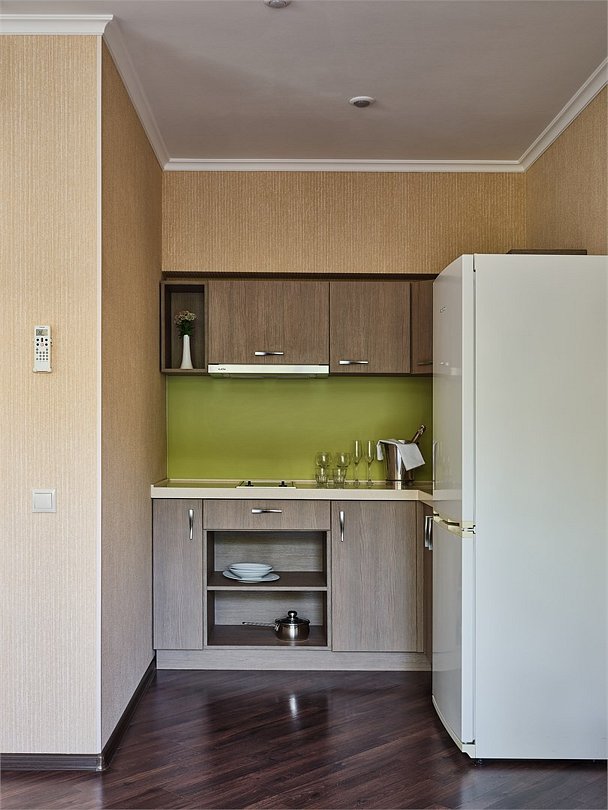 Мини-кухня: назначение -— разогрев и приготовление простых блюд детского и диетического питания; оборудование — микроволновая печь, холодильник, электрочайник, индукционная мини-поверхность.