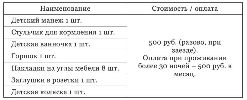 В комплект входят манеж, ванночка, стульчик для кормления, аксессуары для безопасности малыша и прочее. Дополнительно можно арендовать детскую коляску.