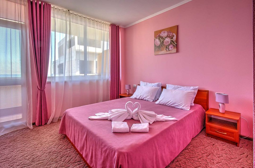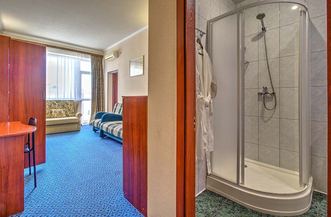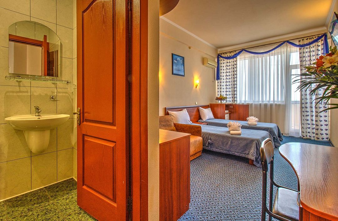Уютный двухкомнатный номер общей площадью 34 кв.м с двумя балконами– это идеальный вариант для семейного отдыха. Номер данной категории состоит из двух смежных комнат – гостиной с мягким раскладным диваном и спальни с двуспальной кроватью, с каждой комнаты есть выход на собственный балкон с видом на море. Просторная ванная комната оснащена душевой кабиной и всеми необходимыми принадлежностями для комфортного отдыха. Парковки у Отеля нет!Услуги и удобства