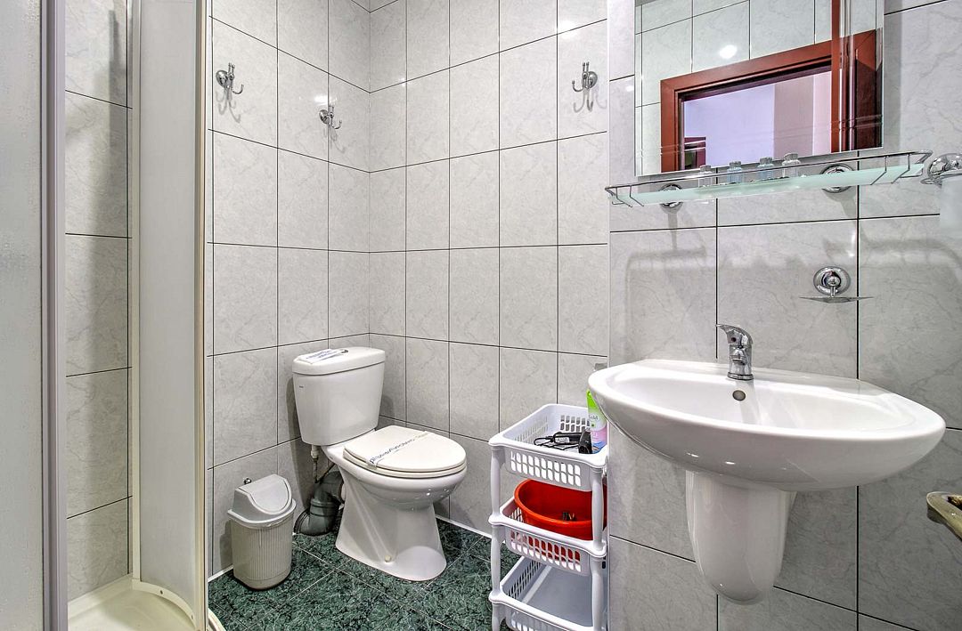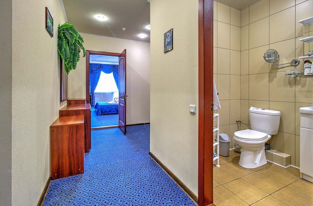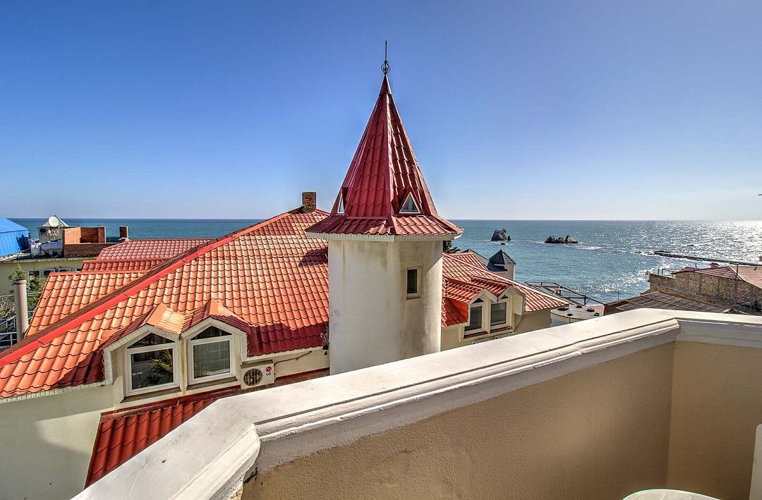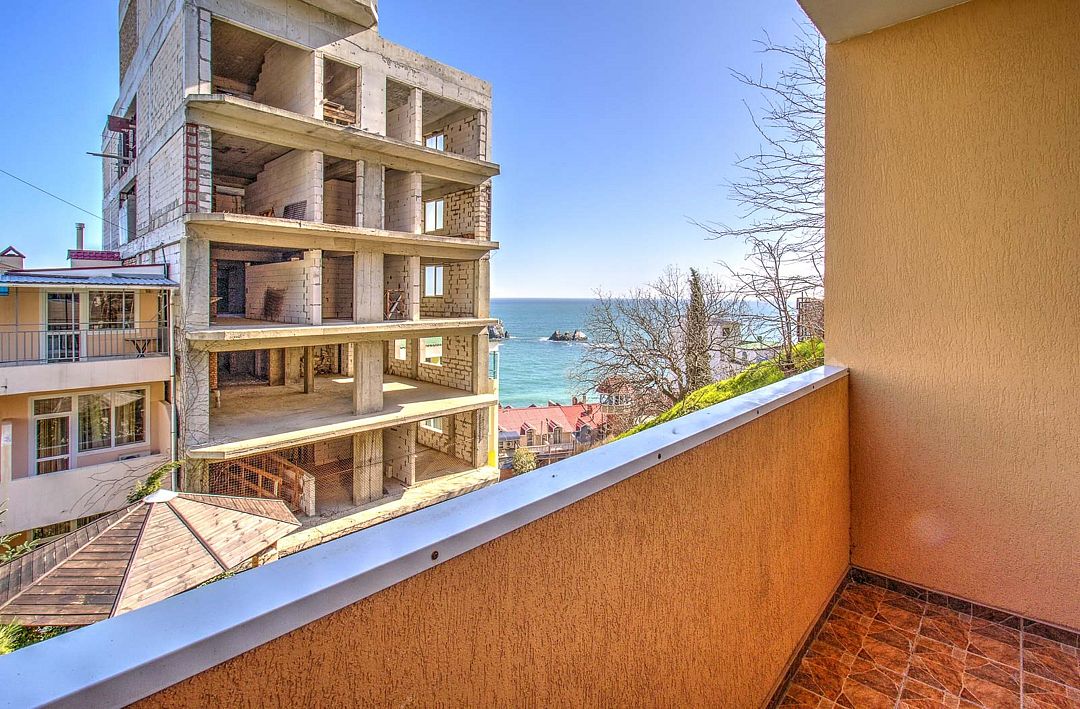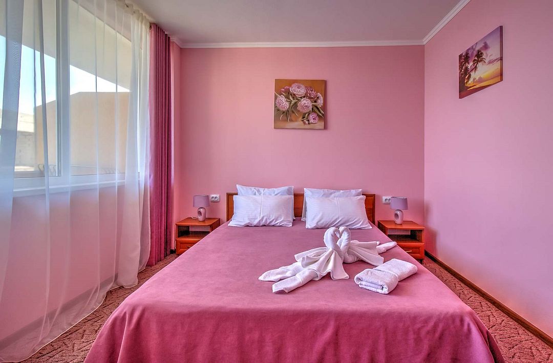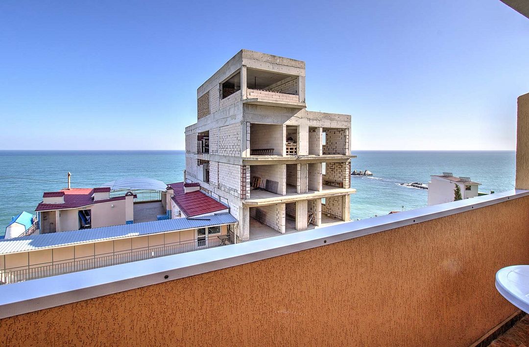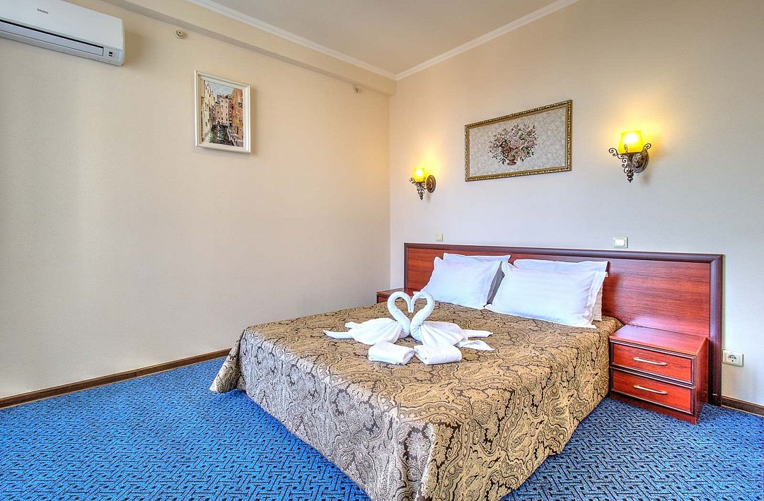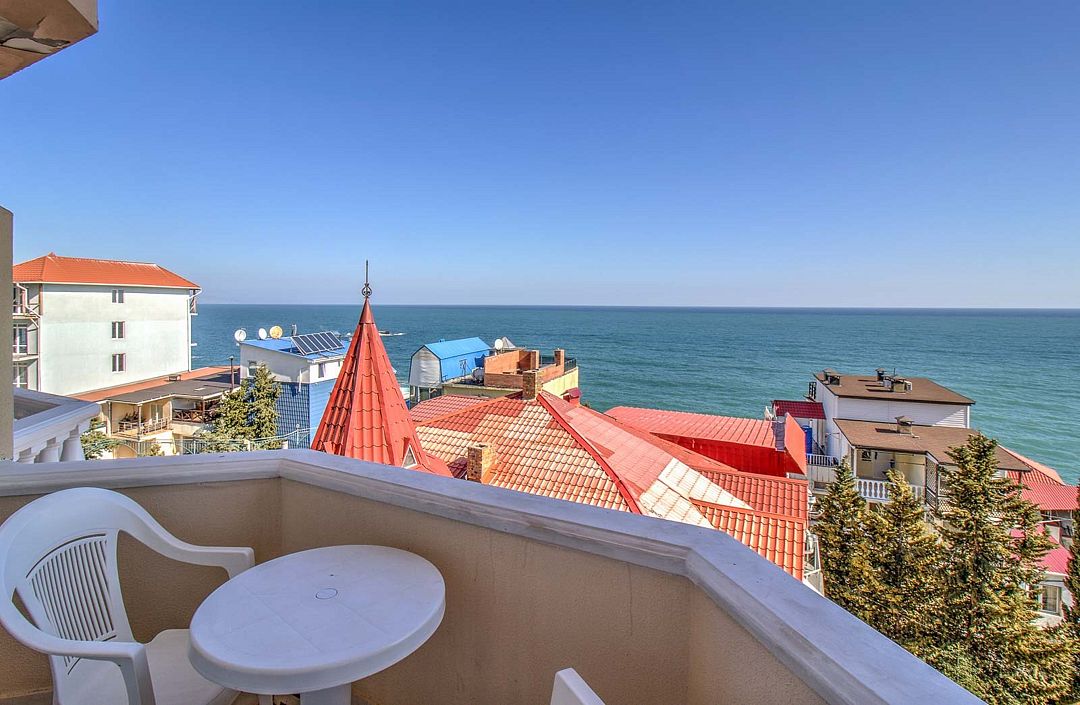 Просторный двухкомнатный номер общей площадью 50 кв.м с двумя балконами - это номер повышенной комфортности, где в распоряжение гостей предоставляется расширенный перечень мебели и бытовых приборов, который сделает отдых максимально полноценным и комфортным. Номера данной категории имеют две отдельные комнаты, разделенные прихожей, с каждой комнаты есть выход на собственный балкон. С одного балкона открывается чудесный панорамный вид на Черное море, которое утром светится при игривых лучах солнца, а вечером утопает в ярких красках заката. Со второго балкона вид на зеленый дворик отеля, где витает запах фитонцидов выделяемые хвойными растениями нашего сада. Просторная ванная комната оснащена угловой ванной и всеми необходимыми принадлежностями для отличного отдыха. Парковки у Отеля нет!Услуги и удобства
