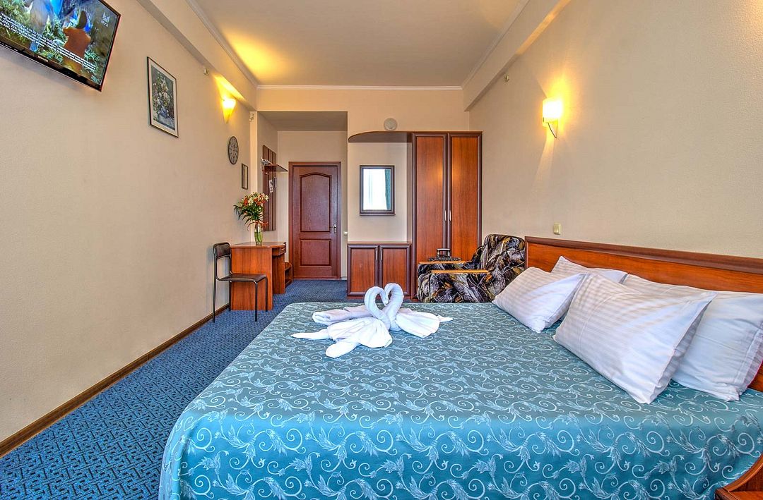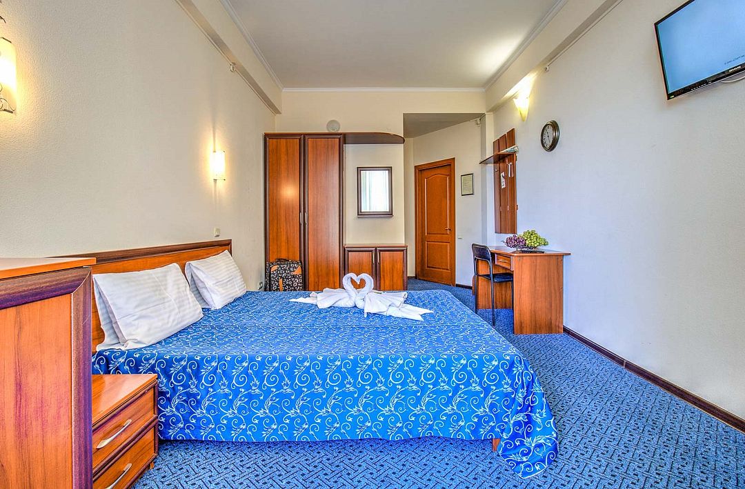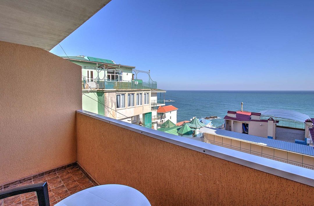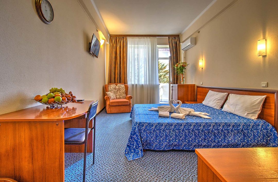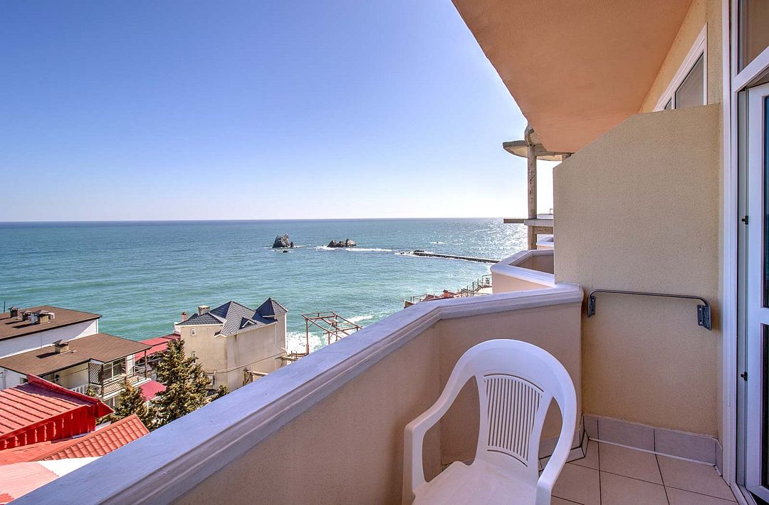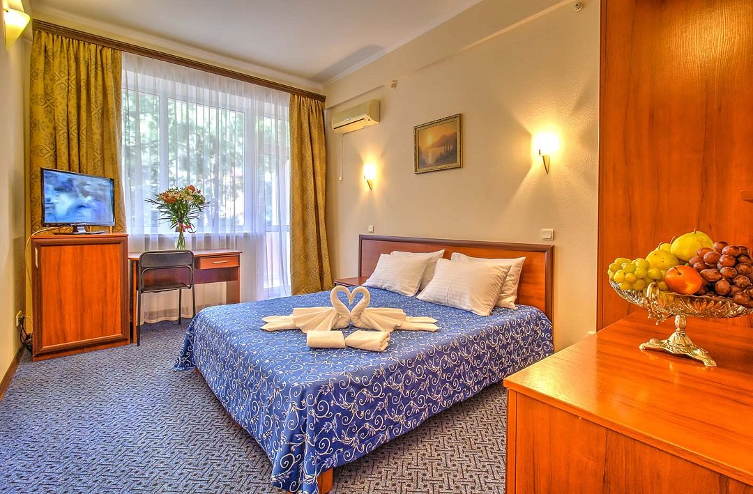 Стандартный однокомнатный номер общей площадью 22 кв.м с двуспальной или двумя односпальными кроватями, открытым балконом с прекрасным видом на Черное море – комфортабельный и выдержанный в элегантном стиле. Каждый номер идеален для гостей, которые хотели бы отдохнуть от суеты и насладиться морскими пейзажами. Дополнительное место-раскладное кресло. Парковки у Отеля нет!Услуги и удобства