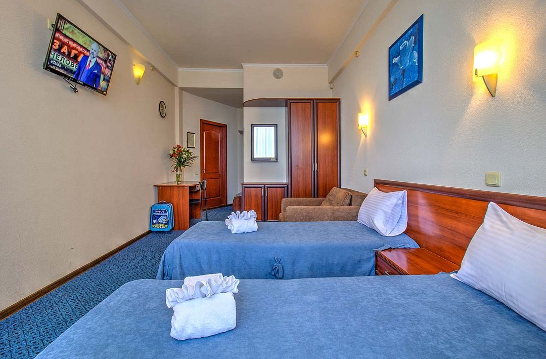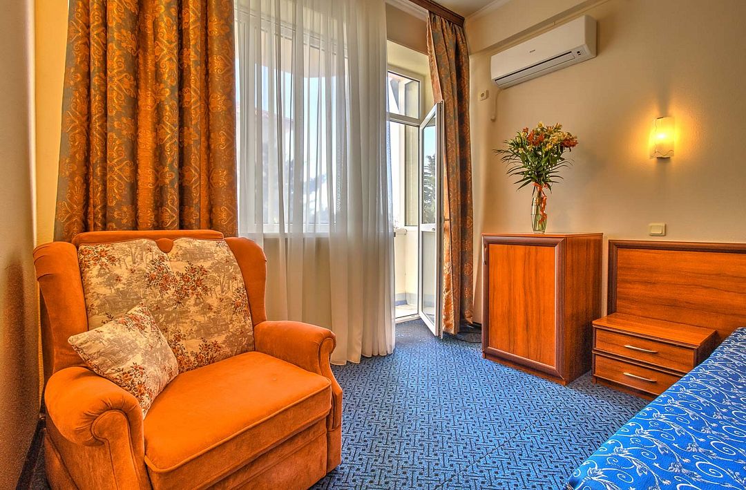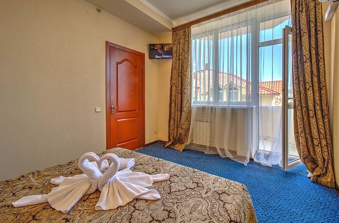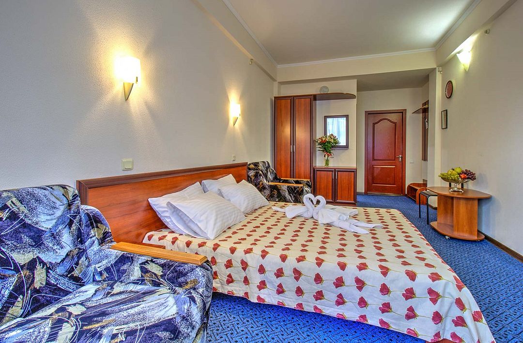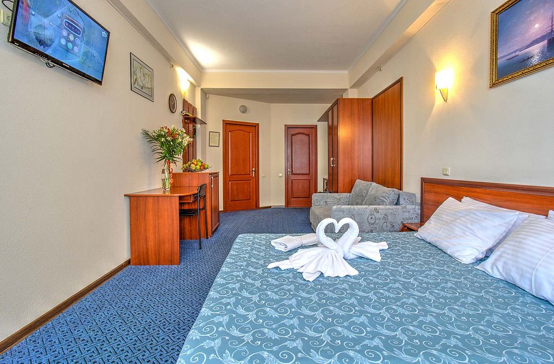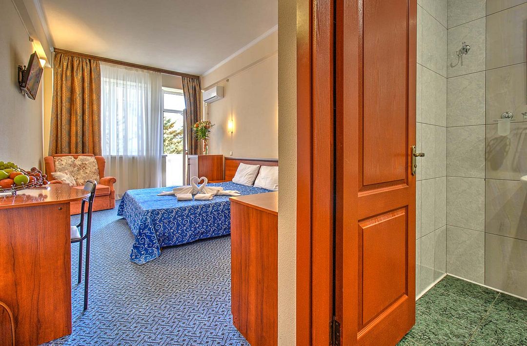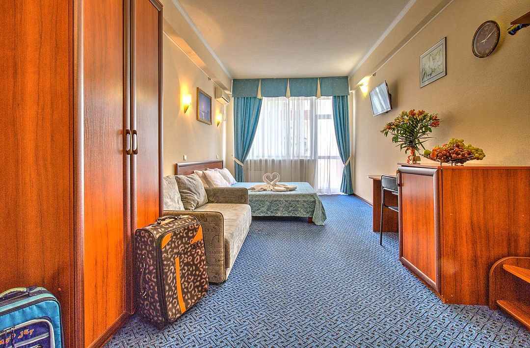 Стандартный однокомнатный номер общей площадью 22 кв.м с двуспальной или двумя односпальными кроватями, открытым балконом с прекрасным видом на Черное море – комфортабельный и выдержанный в элегантном стиле. Каждый номер идеален для гостей, которые хотели бы отдохнуть от суеты и насладиться морскими пейзажами. Дополнительное место-раскладное кресло. Парковки у Отеля нет!Услуги и удобства