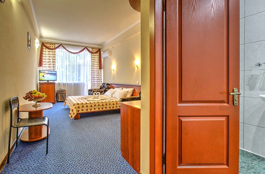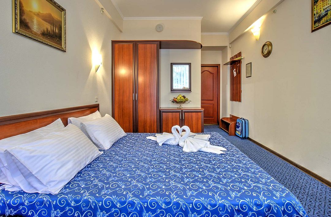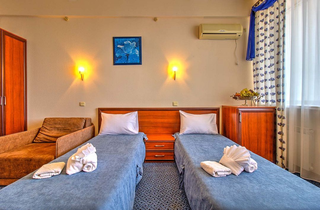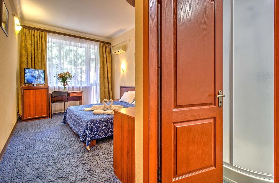 Двухместный однокомнатный номер со всеми удобствами общей площадью 20 кв.м, оборудованный двумя раздельными или одной двуспальной кроватью. Это оптимальный вариант для комфортного отдыха вдвоём. С балкона номера открывается вид на зеленую зону отеля, где растут как хвойные, так и экзотические растения, которые наполняют фитонцидами воздух. Дополнительное место-евро раскладушка. Парковки у Отеля нет!Услуги и удобства
