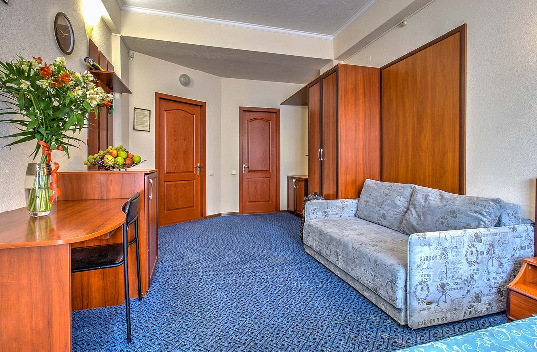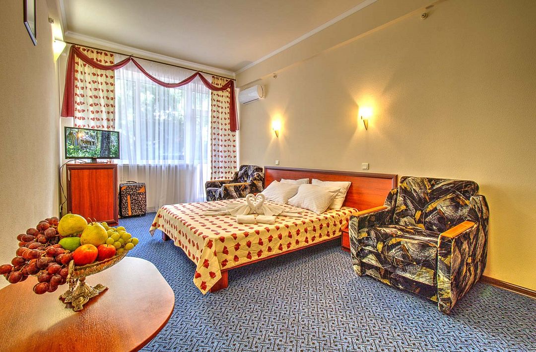 Просторный однокомнатный номер общей площадью 23 кв.м с балконом, который отлично подойдет для размещения до 4 человек. Номер оснащен двуспальной кроватью, для дополнительного места предусмотрены два удобных раскладных кресла, весь необходимый комплект мебели и техники для комфортного отдыха. С балкона номера открывается вид на зеленую зону отеля, где растут как хвойные, так и экзотические растения, которые наполняют фитонцидами воздух. Парковки у Отеля нет!Услуги и удобства