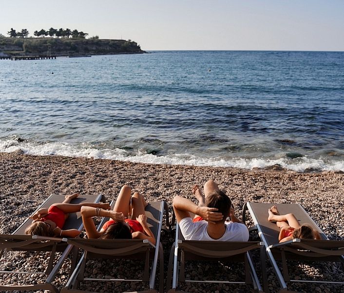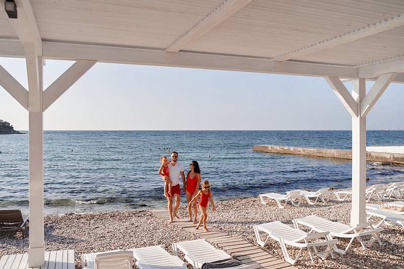- собственный чистый оборудованный галечный пляж (шезлонги, пляжные полотенца, туалеты, душ, видеонаблюдение и Wi-Fi) с июня;