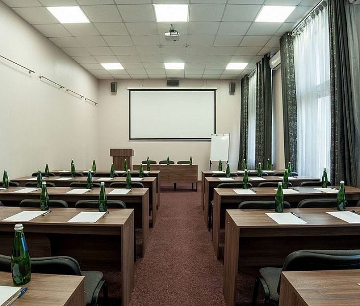 - выдвигающийся экран Digis electra размером 225×300 см; акустическая система, 2 радио микрофона, флипчарт (размер доски 93*60, высота от пола 160); сплит-системы; блэкаут-системы;