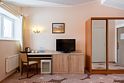 23 м. кв., 2 односпальные кровати или одна двуспальная, шкаф, тумбочки, стол, телевизор, чайник, тапочки, постельное белье и полотенца, собственный сан. узел с душевой, туалетом, раковиной и туалетными принадлежностями