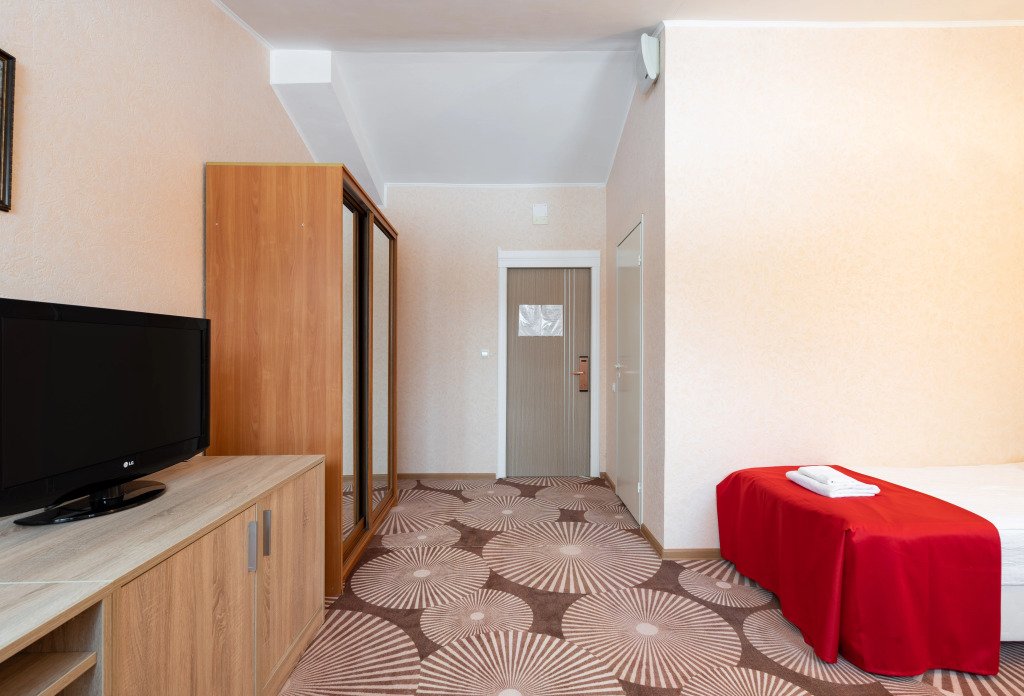 Номер Стандарт идеально подойдёт для комфортного размещения двух гостей, ценящих идеальное соотношение цены и качества, и удивит повышенным уровнем оснащения. Внутри - просторная кровать, вместительный шкаф, телевизор, чайник и оборудованная уборная.