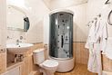 30 м. кв., двуспальная кровать, шкаф, тумбочки, стол, телевизор, чайник, тапочки, постельное белье и полотенца, собственный сан. узел с душевой, туалетом, раковиной и туалетными принадлежностями