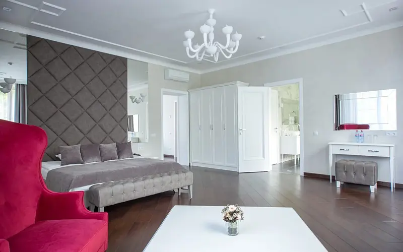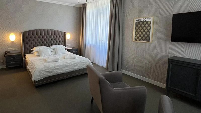Номер категории Президентский Люкс сочетает комфортабельность и стилистическое оформление с видом на Финский залив (вид из гостиной) и на лес (вид из спальни), состоит из 2-х комнат, ванной и большой прихожей.