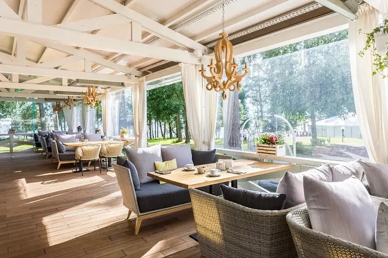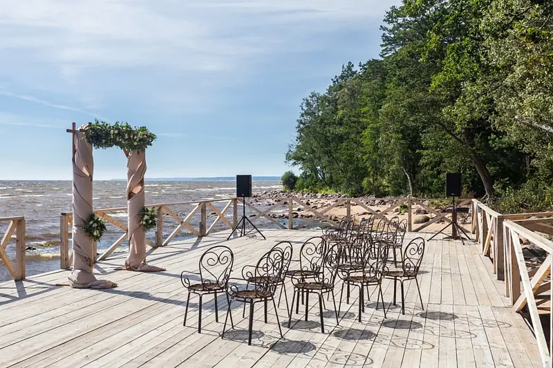 Открытая летняя площадка с видом на залив и территорию. Вместимость: до 90 гостей. При необходимости закрывается от дождя и ветра, обогревается. Работает с мая по октябрь.