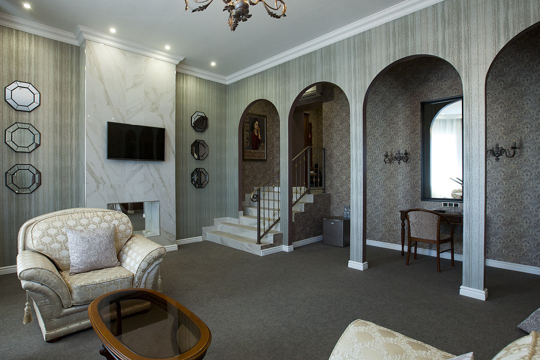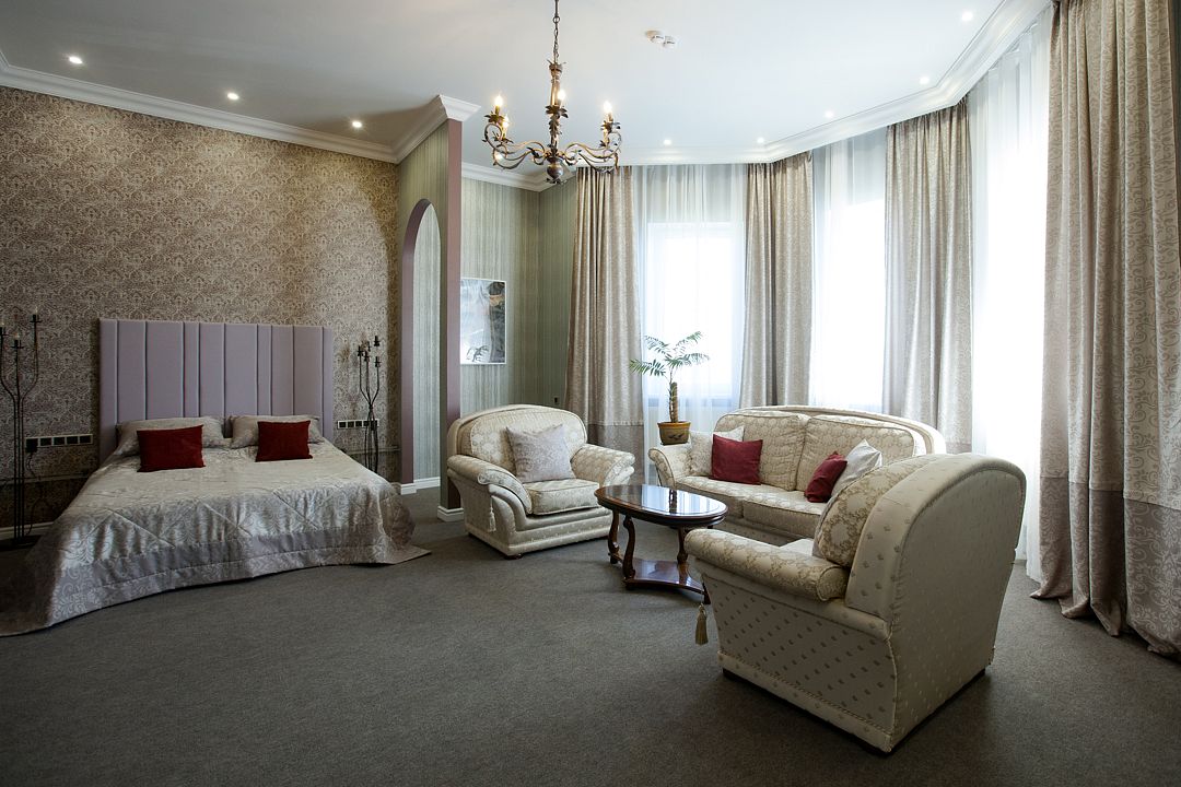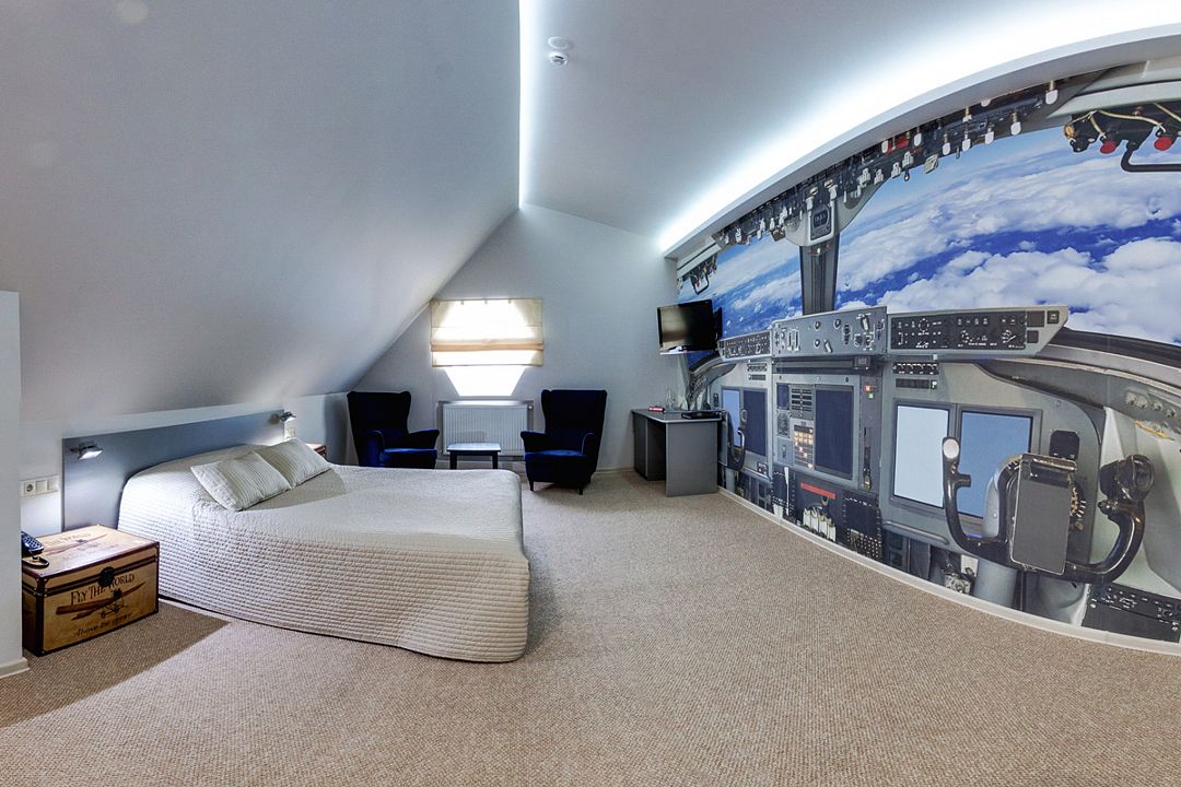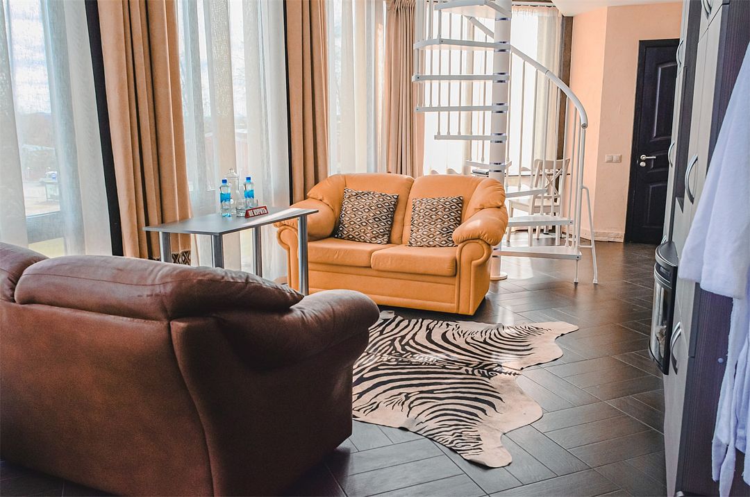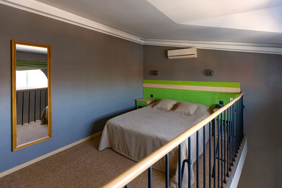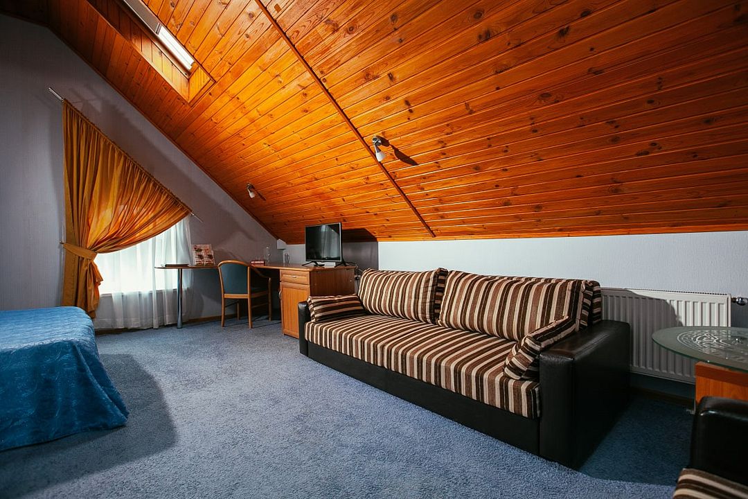 Просторный однокомнатный двухместный номер с возможностью дополнительного места. Два номера данной категории двухуровневые. Есть номер с балконом и хорошим видом на Черноголовский пруд. Один номер категории «Полулюкс» выполнен в стиле «самолет».