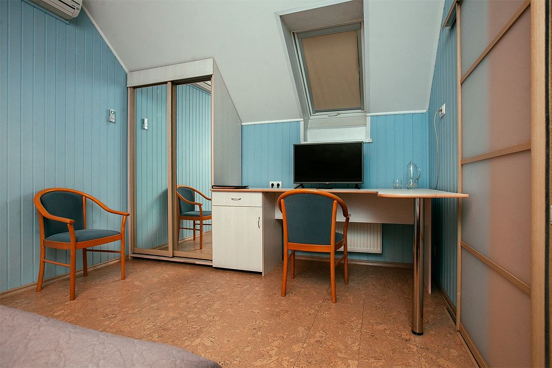 Номер категории "стандарт" достаточно просторный. Есть два платяных шкафа, стол, сейф, фен. Нет электрического чайника и посуды (правда, в коридоре имеется кулер). Жаль, что отсутствует балкон.