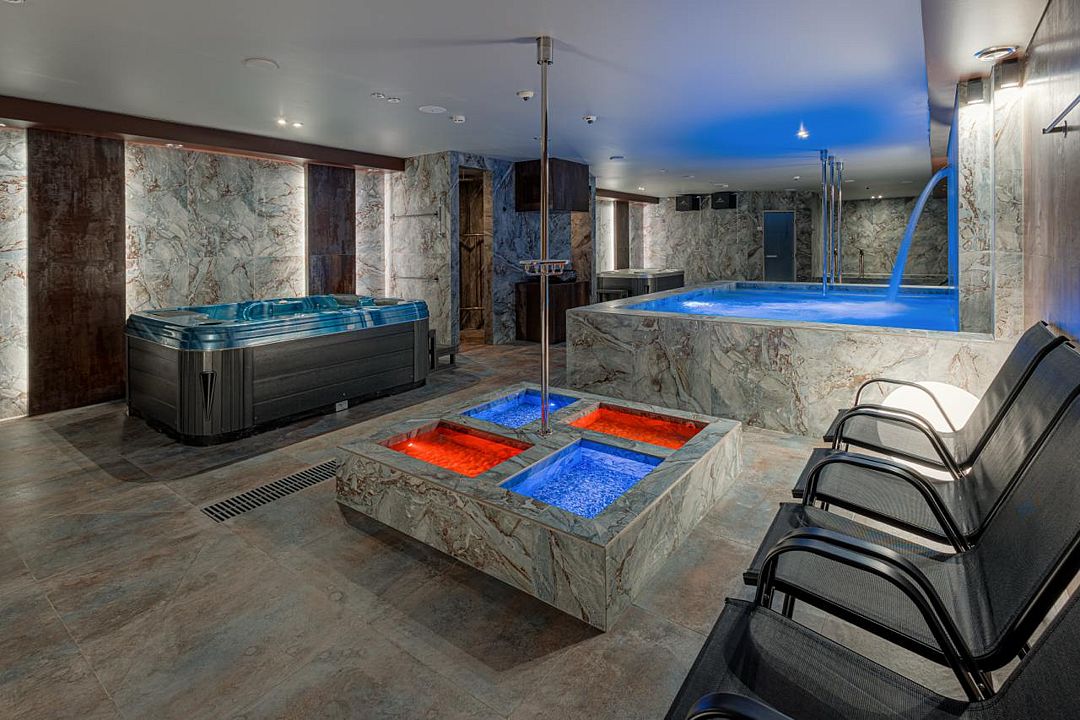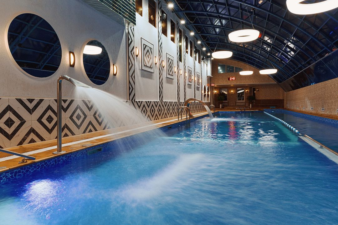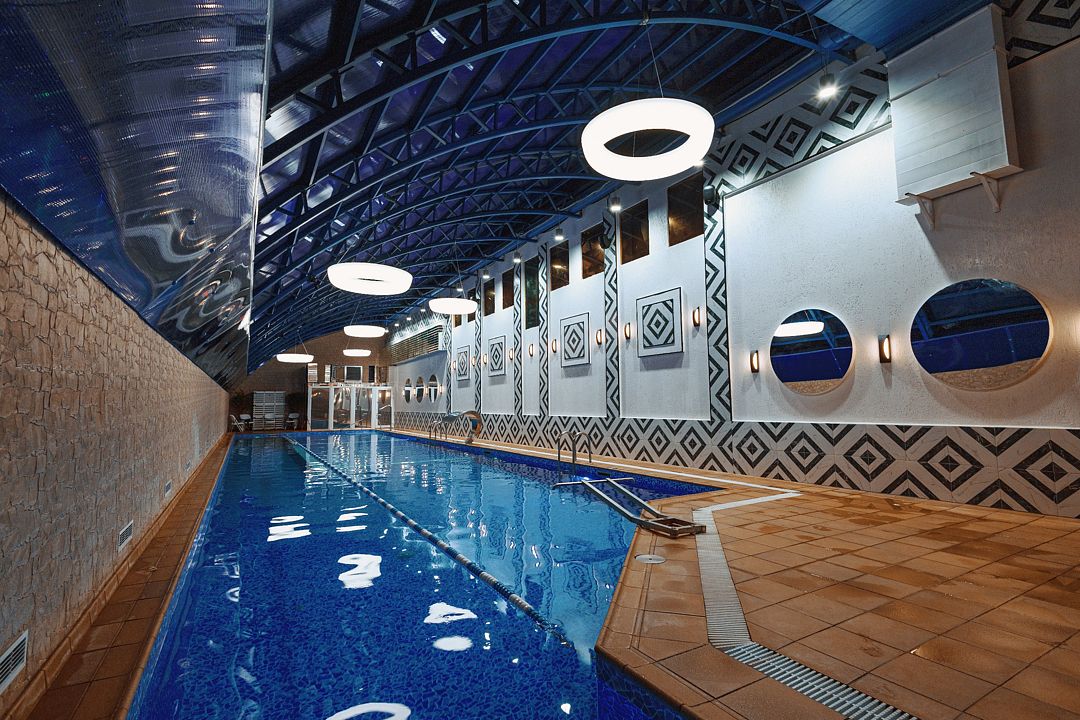 Тип бассейна: крытый бассейнТемпература в бассейне: 29 °CРазмеры: 6 x 25 мПлощадь: 150 м²Время работы: круглосуточноГлубина (диапазон): до 215 смПолностью оснащенный оборудованием итальянского производства, а также химпрепаратами и фильтрами. Благодаря особой системе циркуляции вода здесь проходит полный комплекс очистки. Бассейн с фонтанами, трамплином, гейзером и противотоками имеет автоматизированную систему хлорирования. Желающие могут посещать занятия по аквааэробике и плаванию, в том числе и с персональным тренером. Одно посещение – 45 минут. Детям до 12 лет необходимо иметь при себе справку на энтеробиоз.