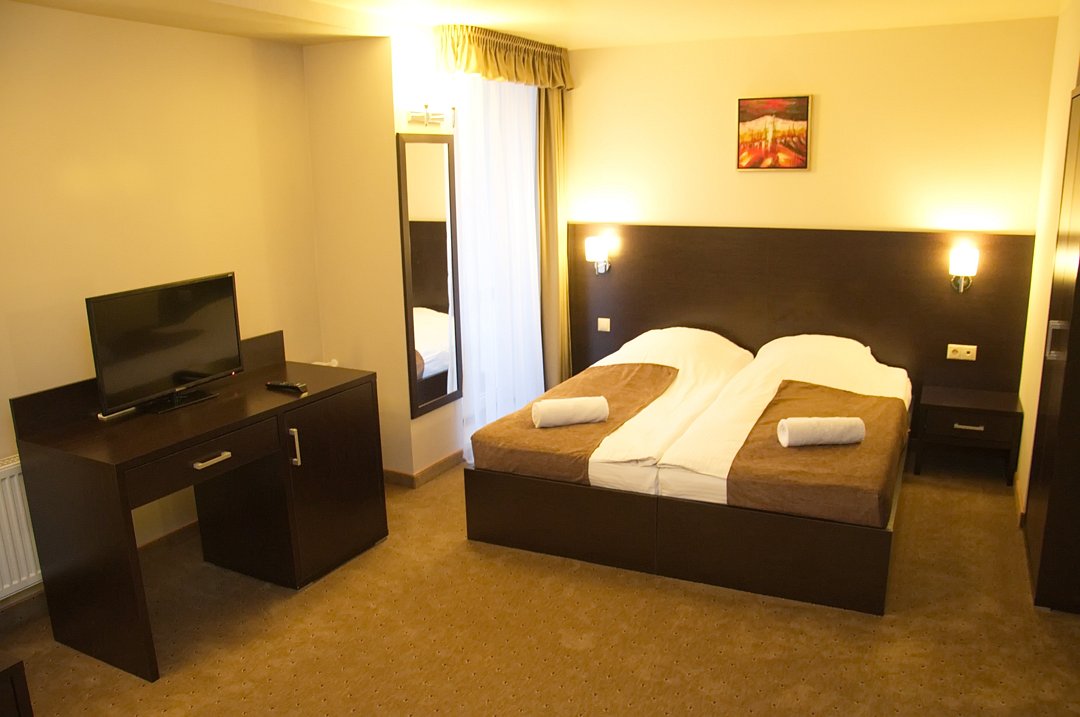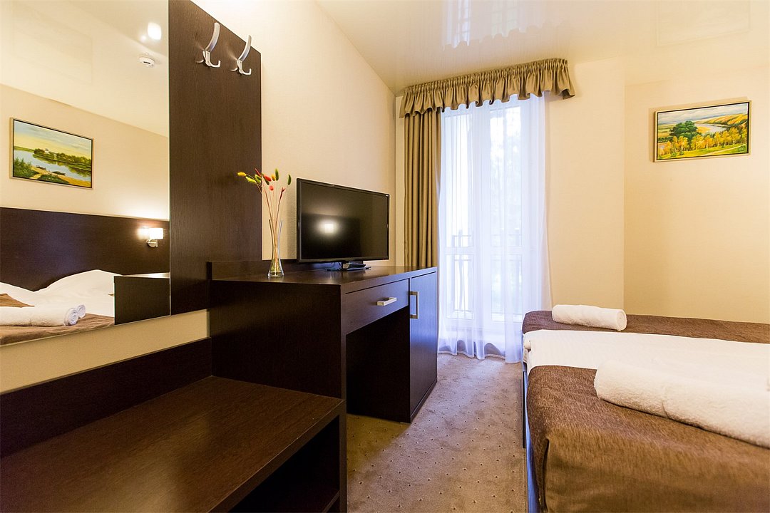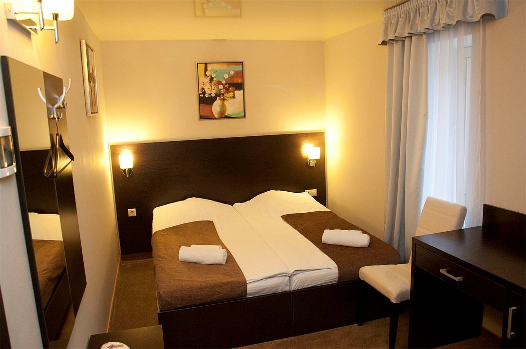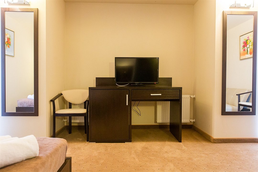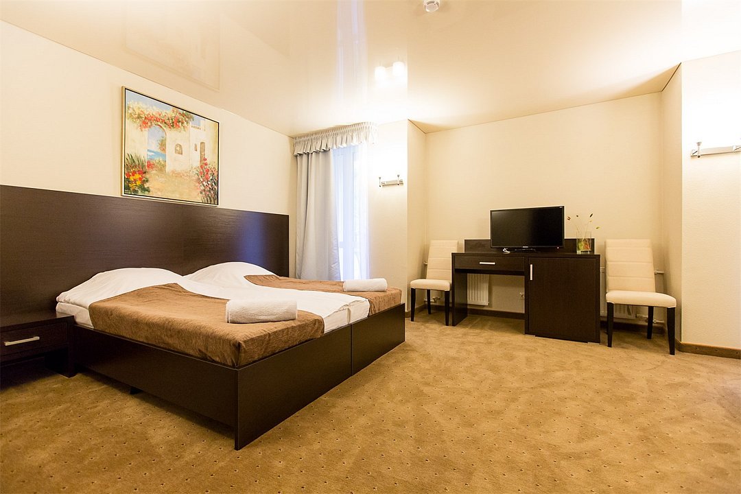 Услуги и удобства: гардероб, рабочий стол, мягкая мебель, телефон, телевизор с плоским экраном, ванная комната, фен, туалетные принадлежности, комплект полотенец.