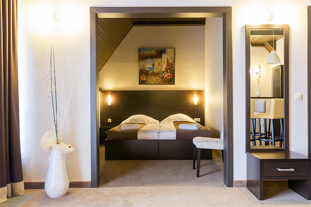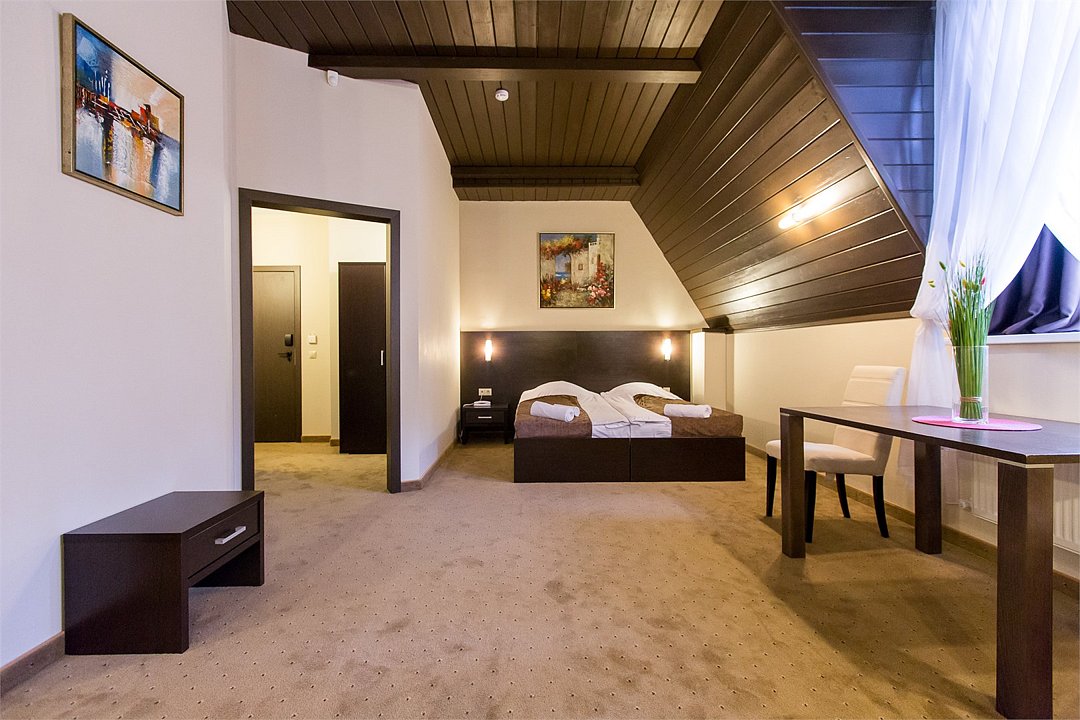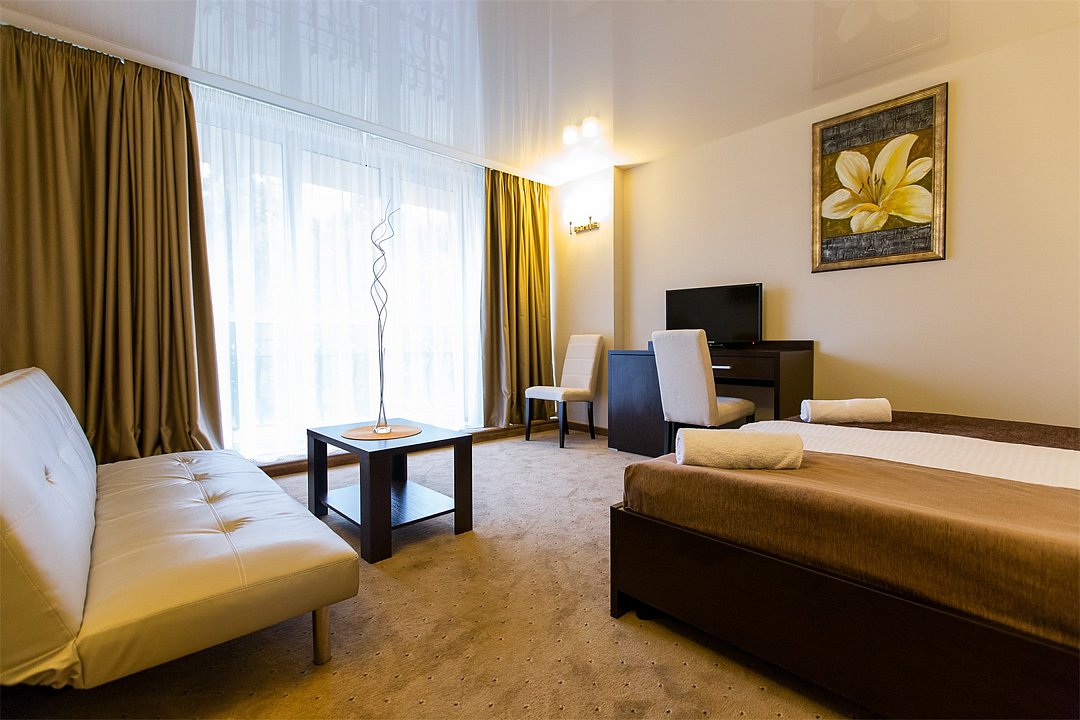 В номере: 2 полутораспальные кровати с удобными матрасами и возможностью бесшовного объединения в большую двуспальную кровать, гардероб, рабочий стол, мягкая мебель, барная стойка, телефон, телевизор с плоским экраном.
