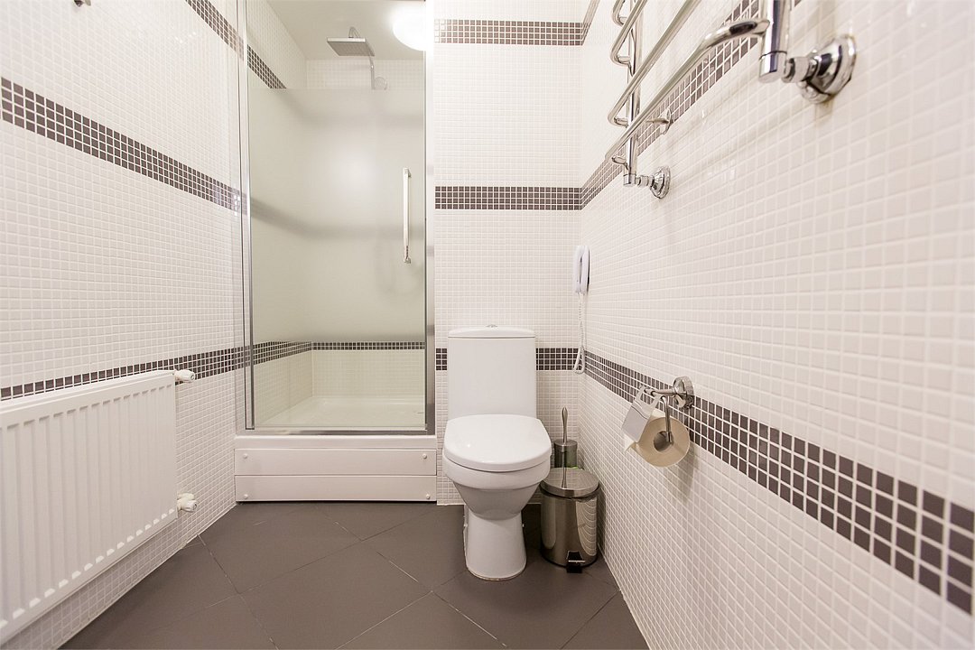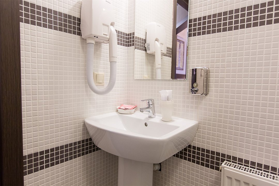 В ванной: ванна или душевая кабина, фен, туалетные принадлежности, комплект полотенец.