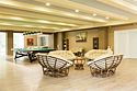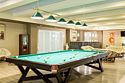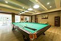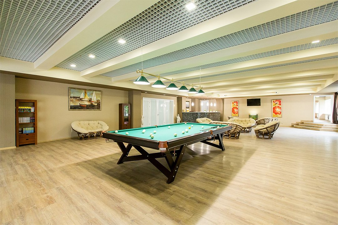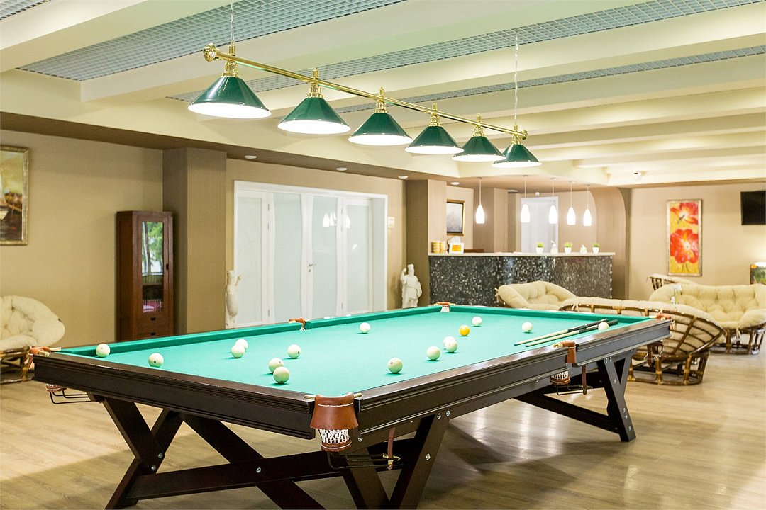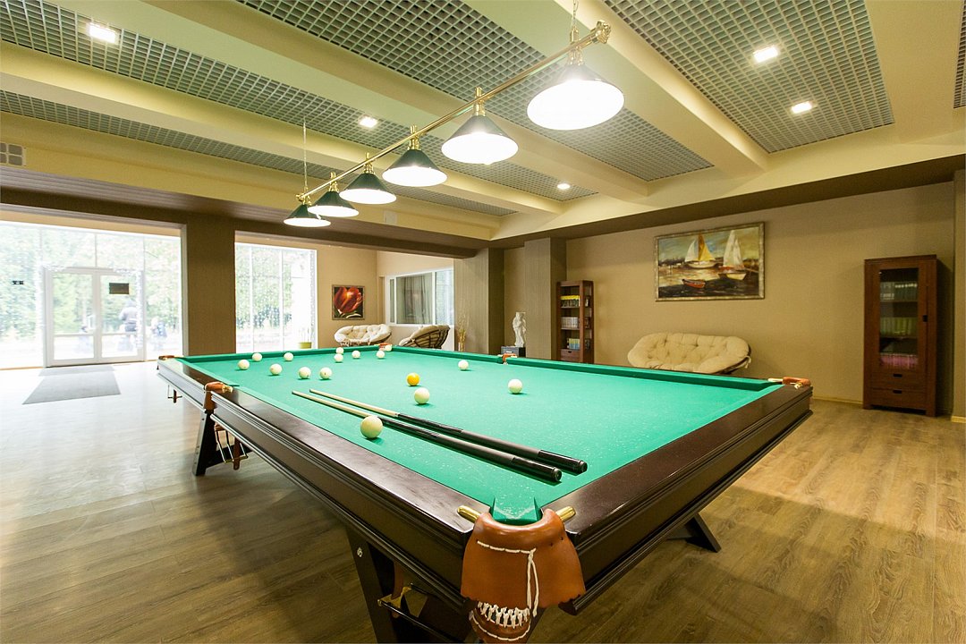 Бильярдная зона с профессиональным оборудованием и мягкими диванами.