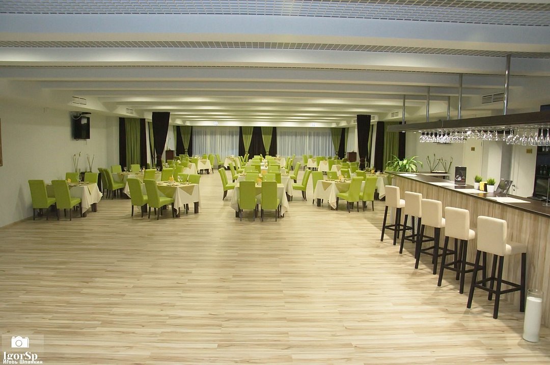 Площадь зала 160 кв.м. Дизайн зала подходит для проведения корпоративных банкетов. В зале установлено звуковое и световое оборудование, микрофоны.