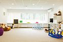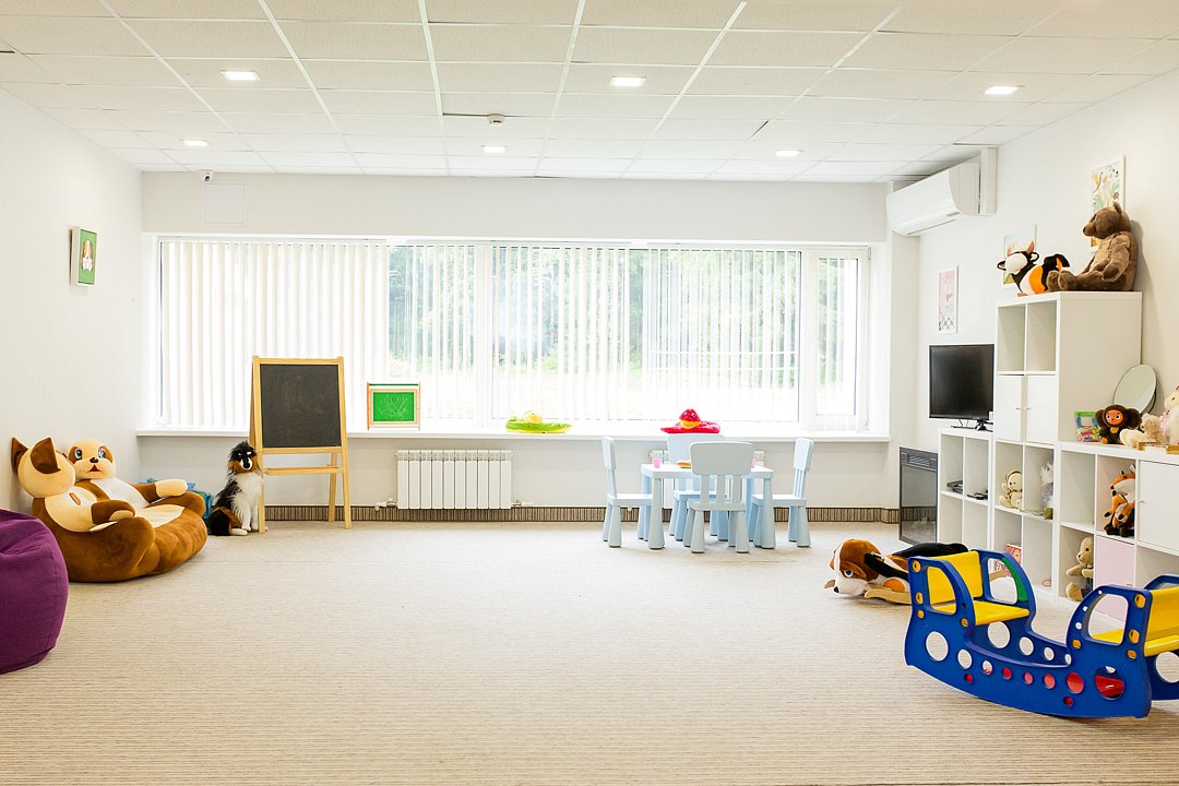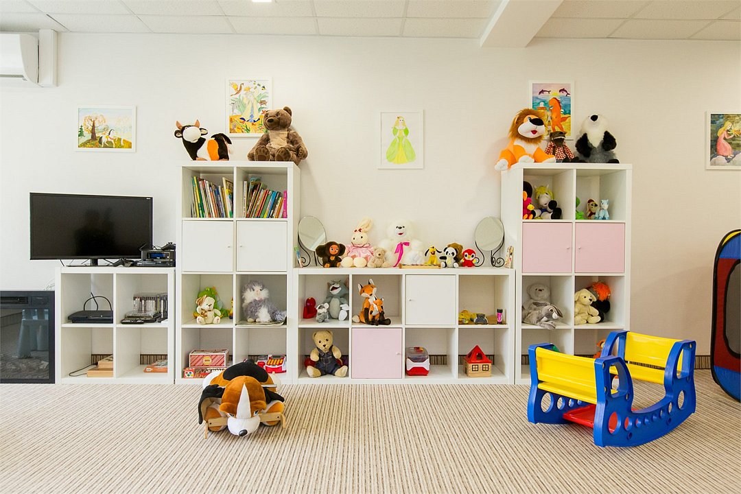В просторном и светлом помещении находится множество игрушек и развивающих игр. Комната оборудована мягким половым покрытием и пуфами, которые обеспечат безопасность Ваших детей. Интерьер выполнен в светлых тонах, а яркие игрушки создают веселое и непринужденное настроение.