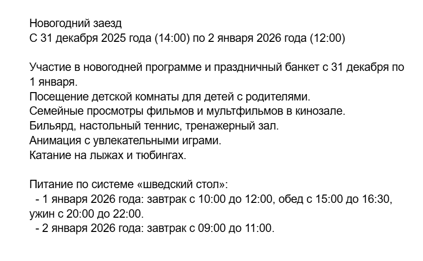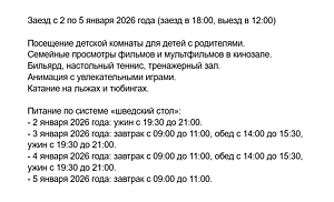- заезд 02.01.2026 с 18:00, выезд 05.01.2026 до 12:00;
