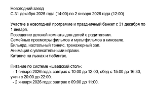 - заезд 31.12.2025 с 14:00, выезд 02.01.2026 до 12:00;
