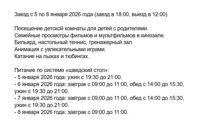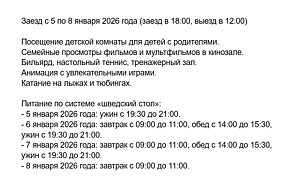 - заезд 05.01.2026 с 18:00, выезд 08.01.2026 до 12:00.