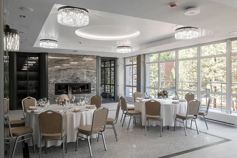 Ресторан «Шелест» — элегантное и просторное пространство, подходящее для банкетов и деловых мероприятий. Интерьер в светлых тонах создает уют, а панорамные окна наполняют зал светом и открывают вид на территорию отеля. Современное оснащение с аудио и видеосистемами, Wi-Fi и кондиционерами обеспечивает комфорт для любого формата событий.