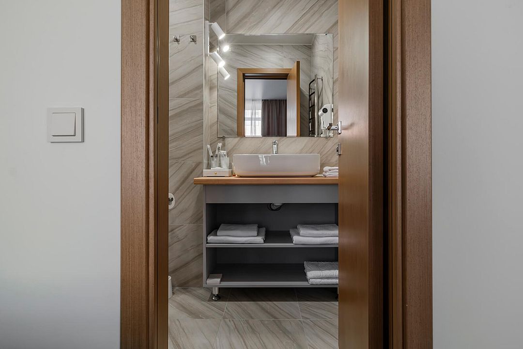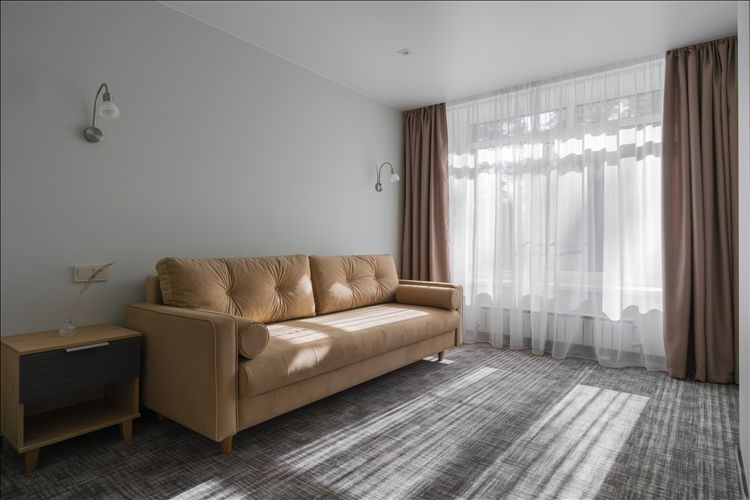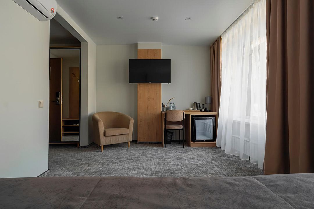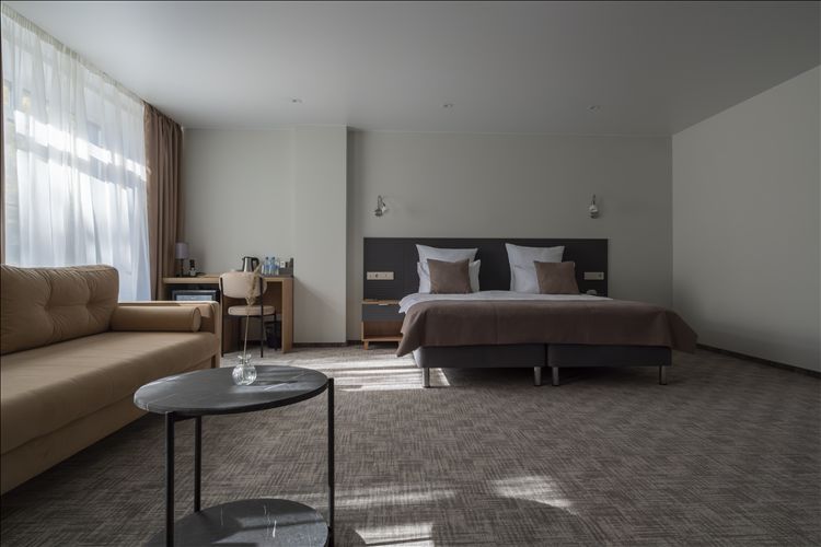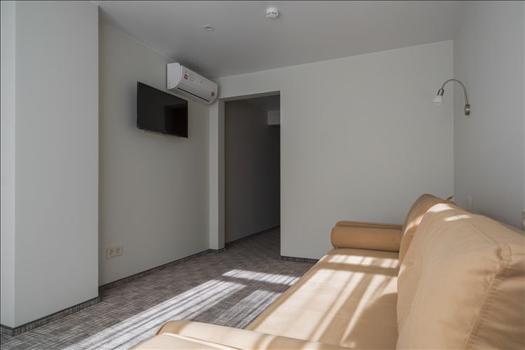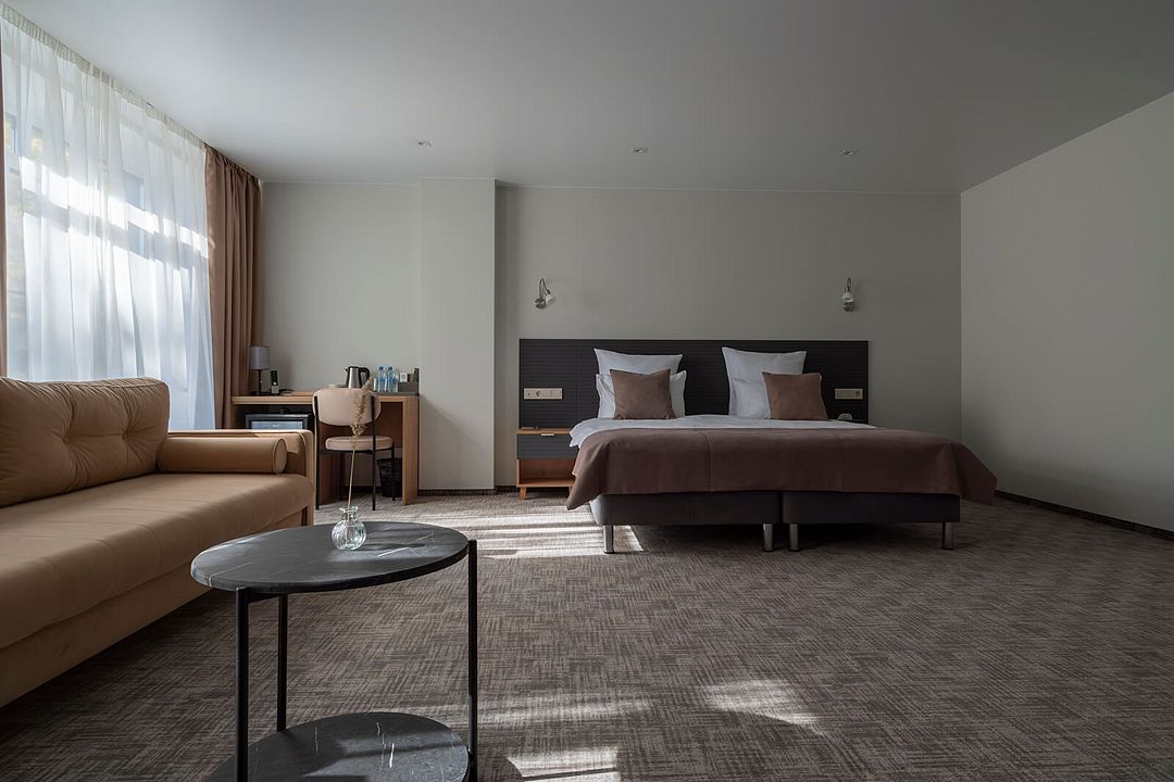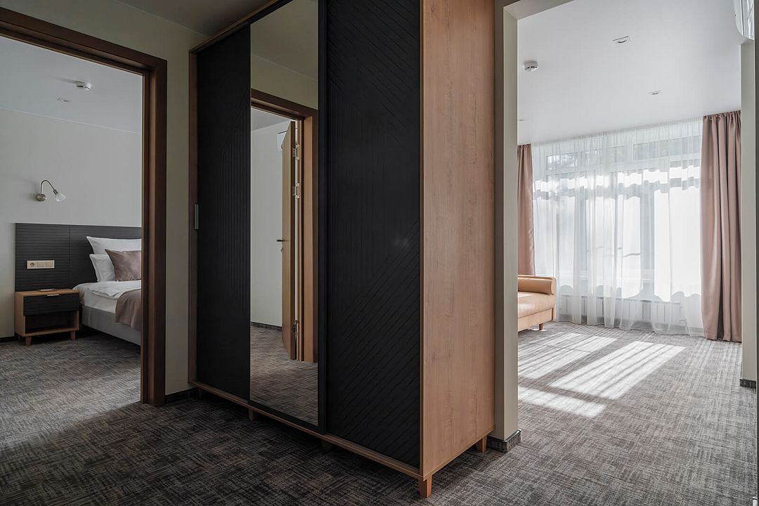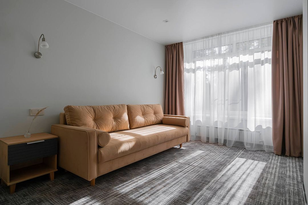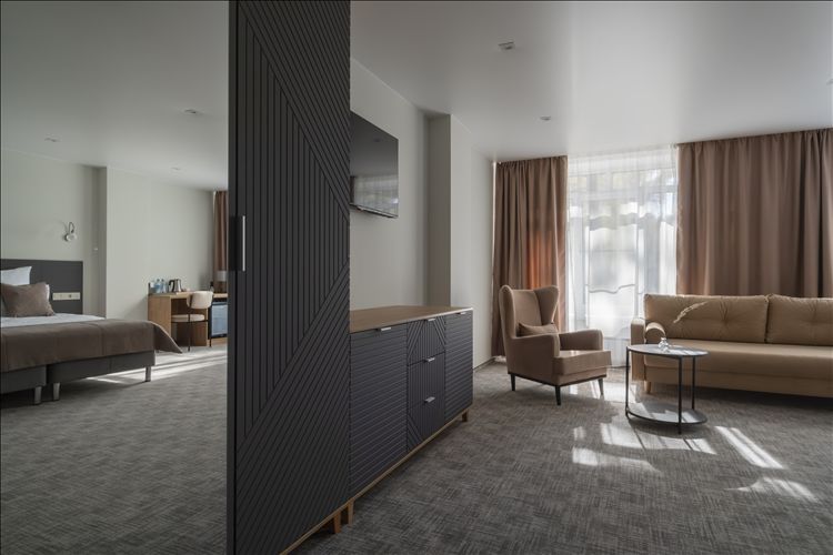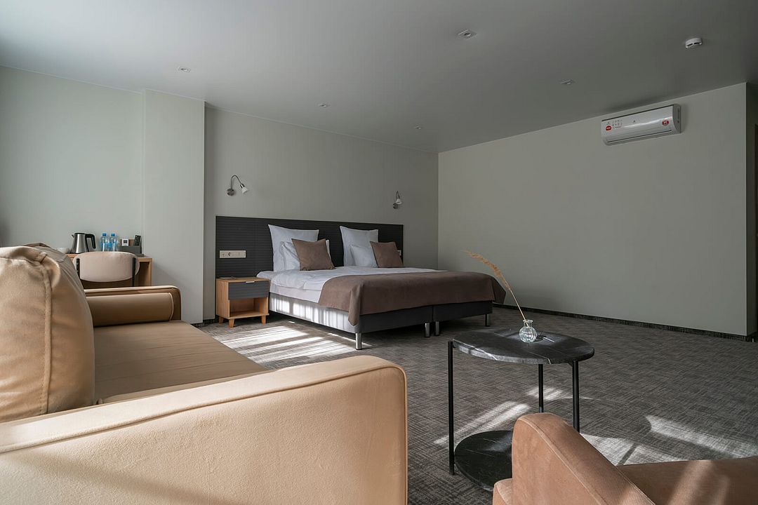 В номере одна двуспальная кровать или две односпальные и комфортный диван в другой комнате.