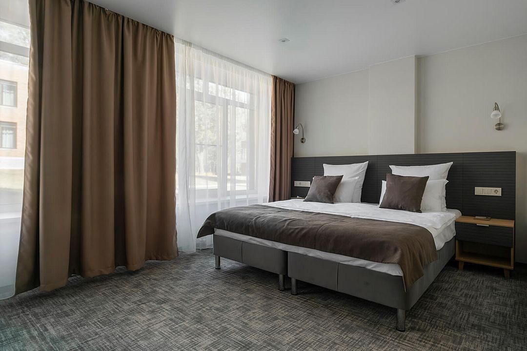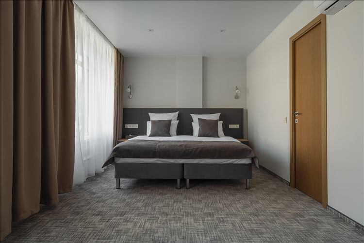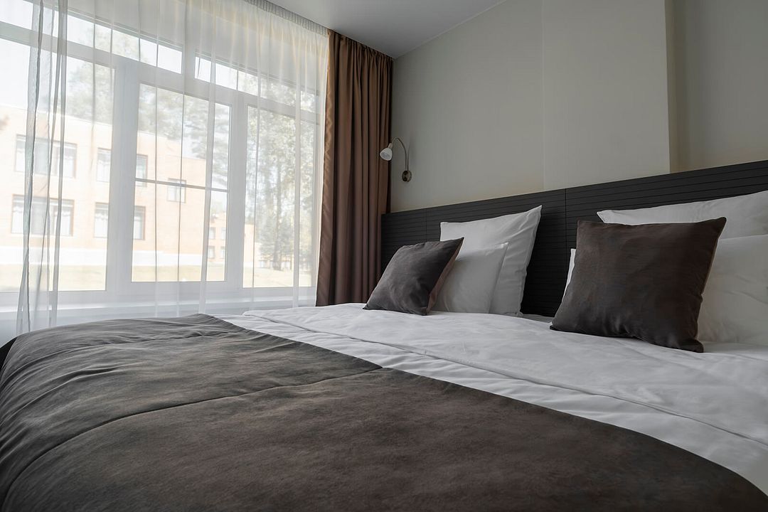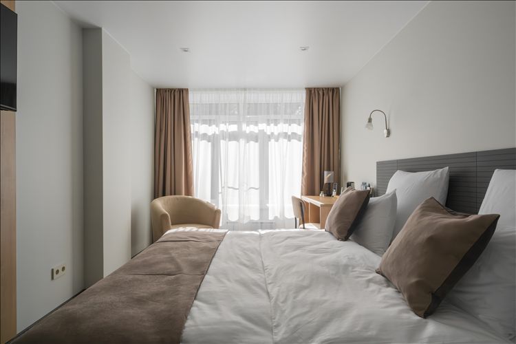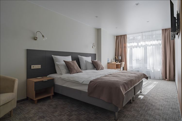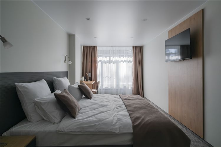 В номере одна двуспальная кровать или две односпальные на выбор. Комплектация номера может отличаться от представленной на фотографиях.