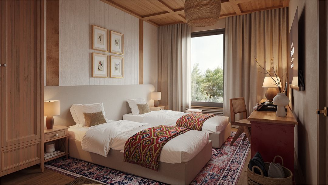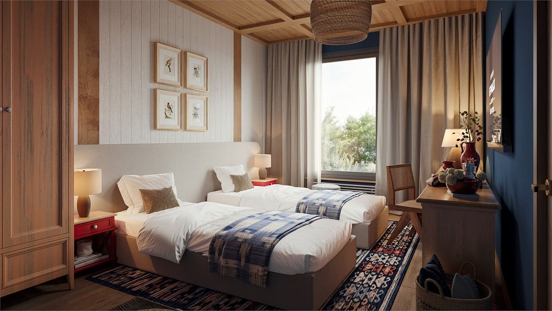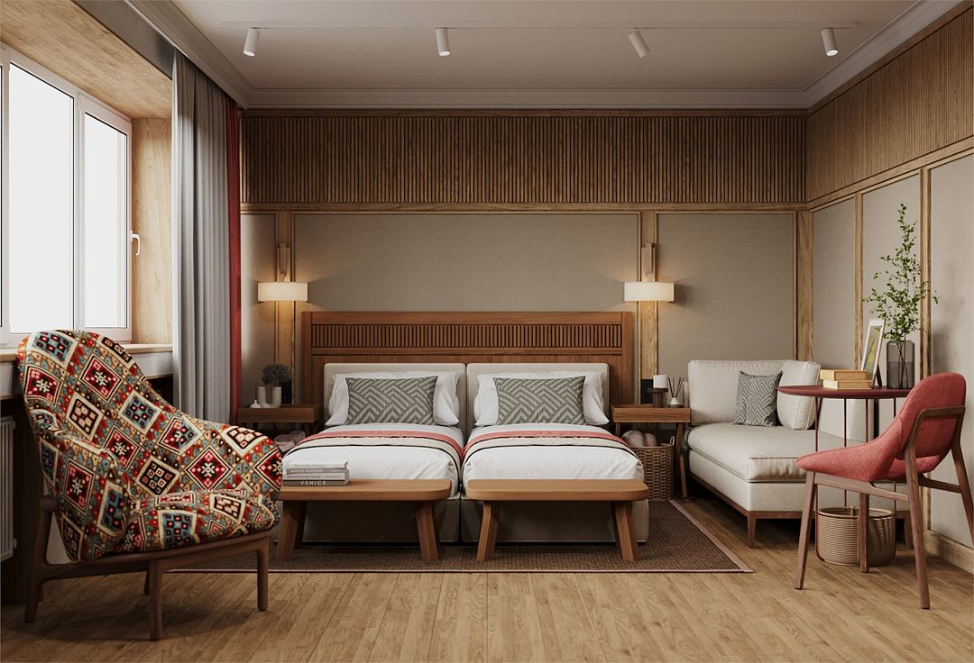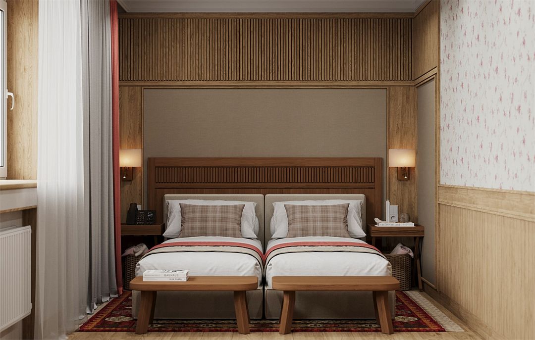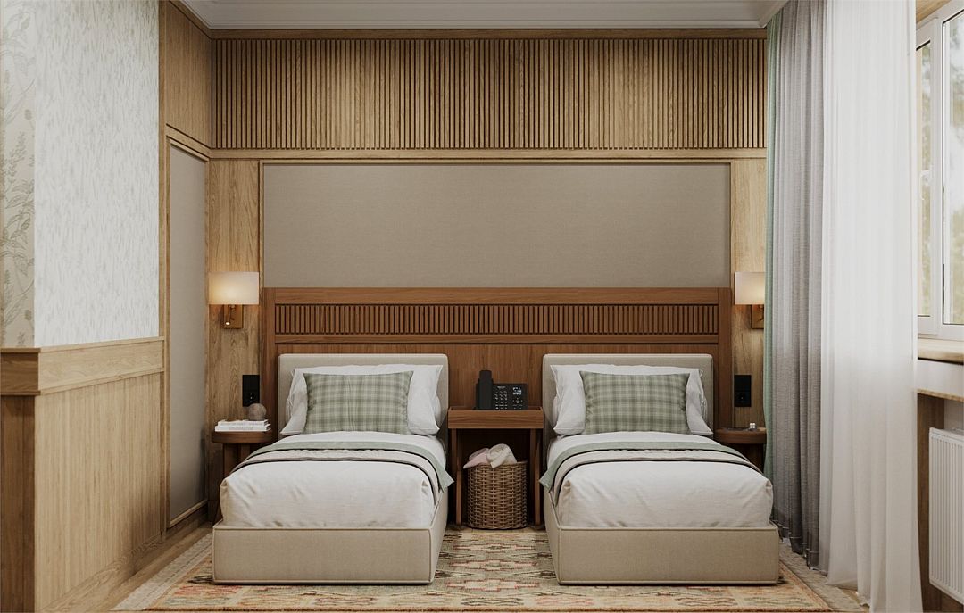 Оформление выполнено в современном стиле с использованием натуральных материалов. В распоряжении гостей — кровати на выбор с анатомическими матрасами, а также меню подушек для индивидуального комфорта. Рабочая зона с письменным столом и удобным креслом позволяет с комфортом поработать или провести вечер за книгой.