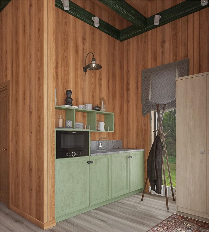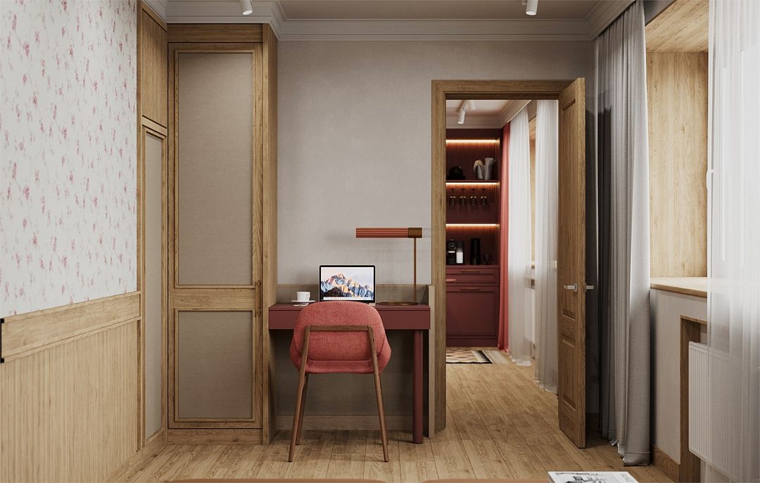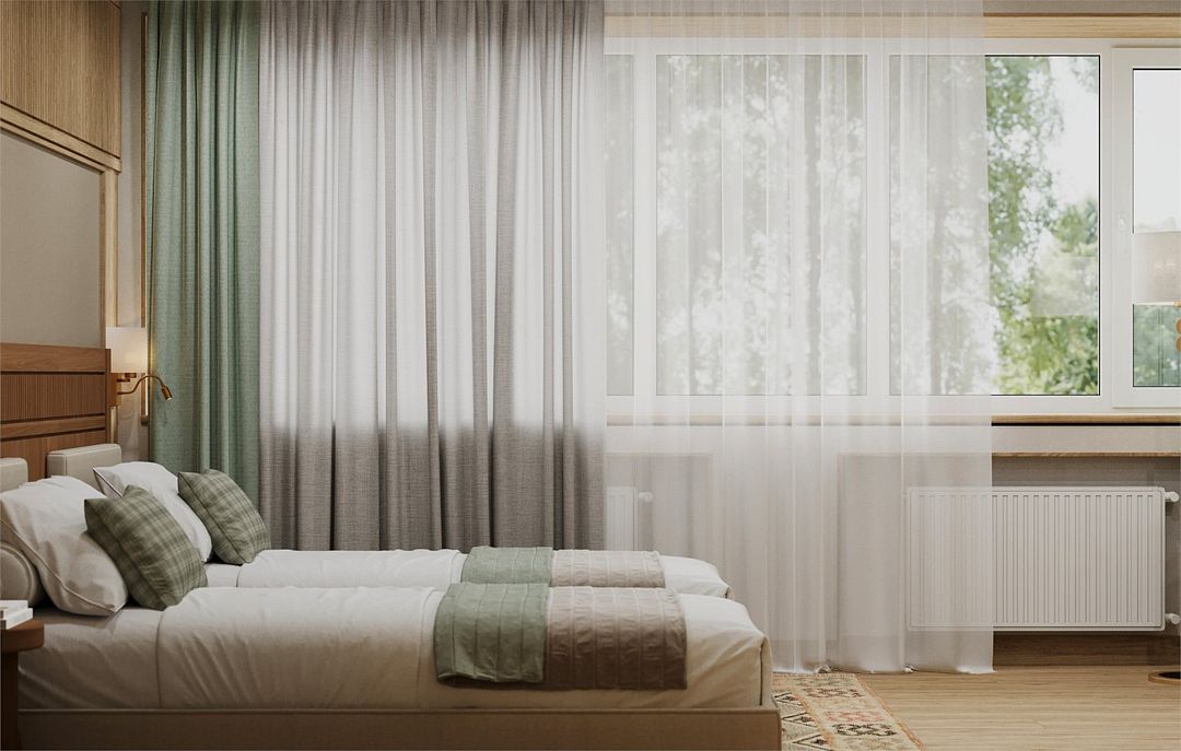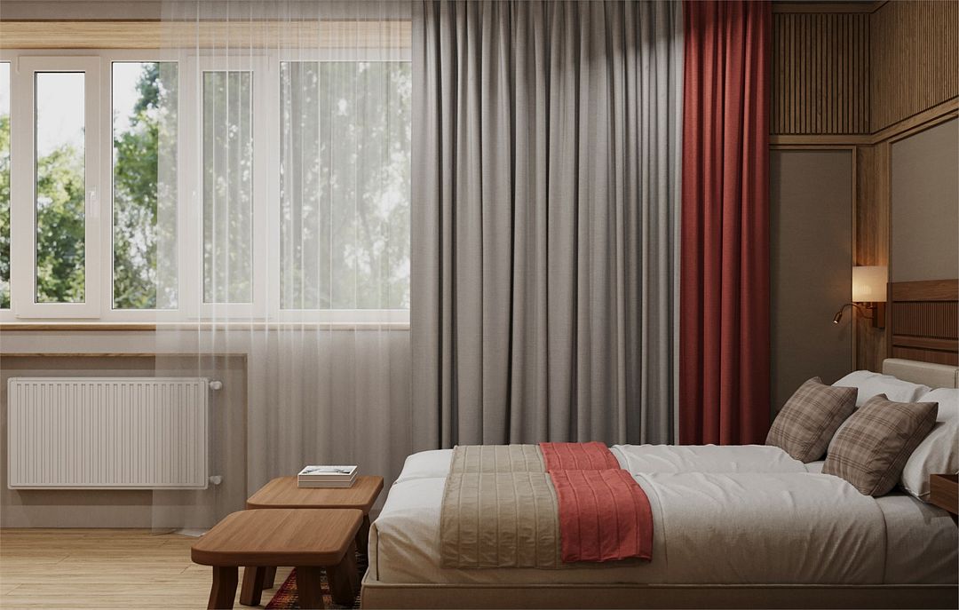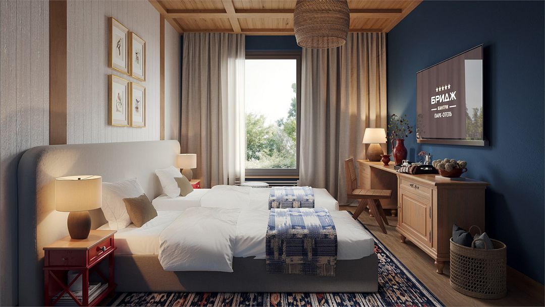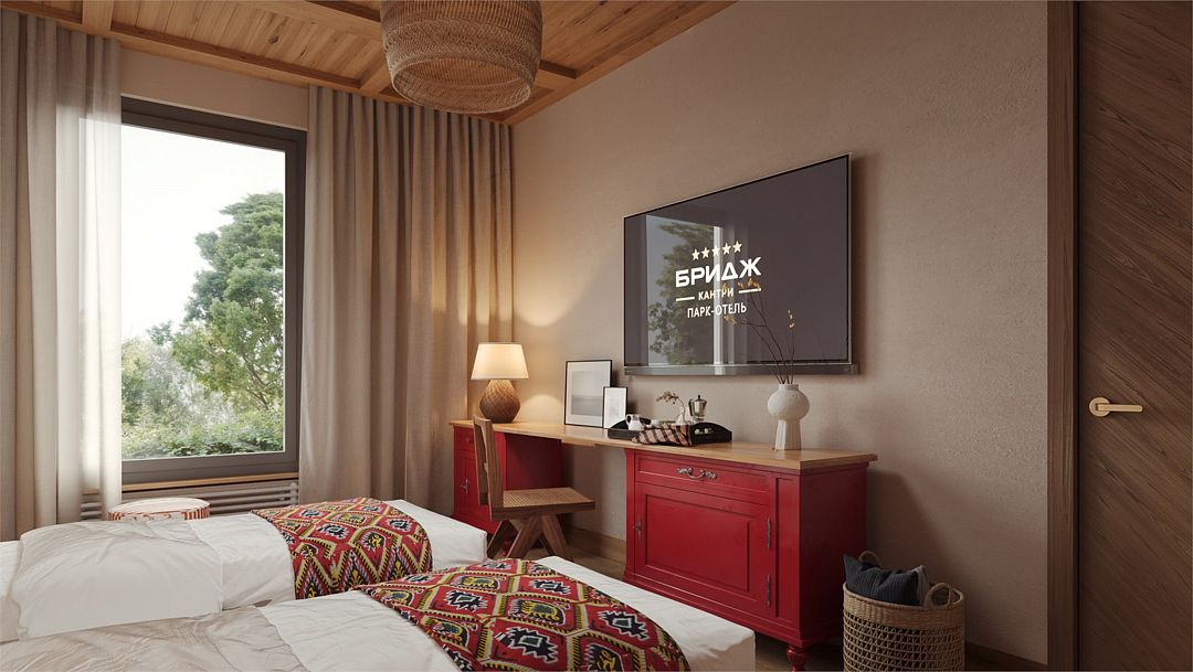 Оформление выполнено в современном стиле с использованием натуральных материалов. В распоряжении гостей — кровати на выбор с анатомическими матрасами, а также меню подушек для индивидуального комфорта. Рабочая зона с письменным столом и удобным креслом позволяет с комфортом поработать или провести вечер за книгой.