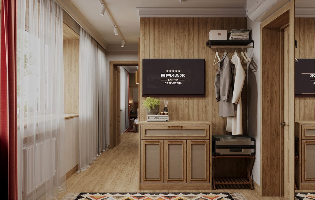 Большие окна наполняют пространство естественным светом и открывают живописный вид на лесной массив или озеро — в зависимости от расположения корпуса. Атмосфера умиротворения и близости к природе делает возвращение в номер особенно приятным после прогулок и активного дня.