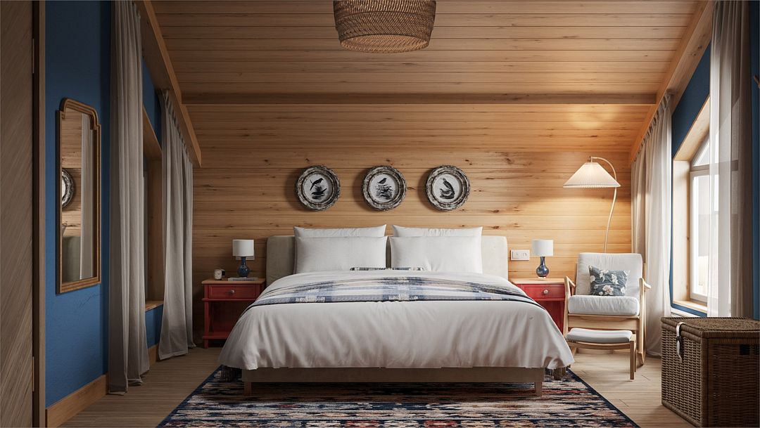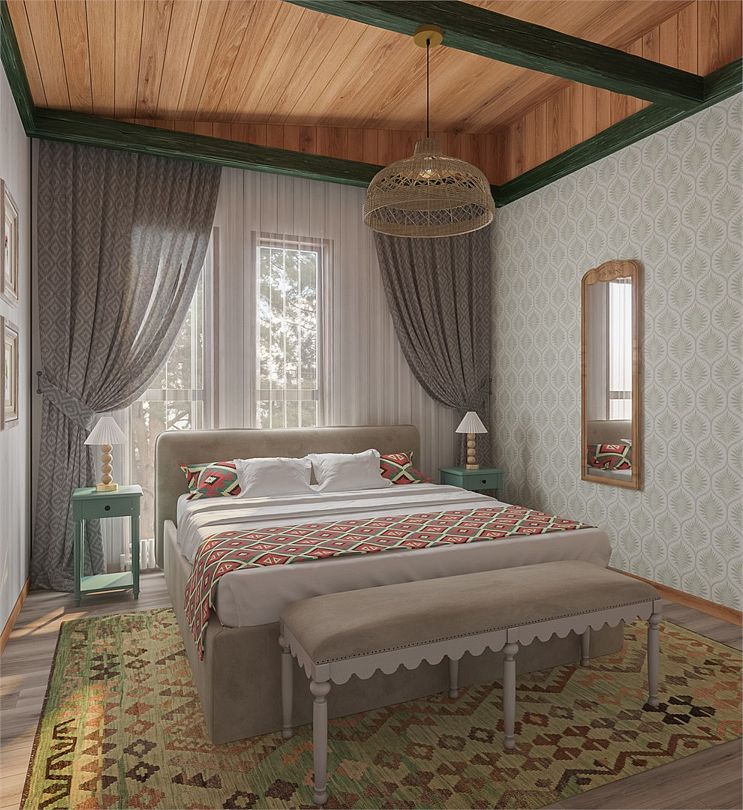 Просторный одноэтажный дом с двумя спальнями, каждая из которых оформлена в индивидуальном стиле.