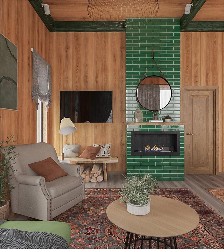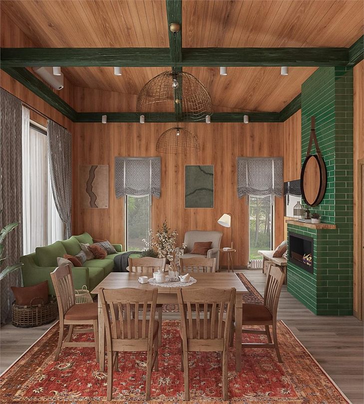 В центре дома — уютная гостиная с панорамными окнами, наполняющими пространство естественным светом и открывающими живописный вид на окружающий ландшафт. Атмосферу тепла и уюта дополняет современный биокамин: живое пламя без лишних хлопот становится стильным и функциональным элементом интерьера. Гостиная словно приглашает собраться всей семьёй за большим обеденным столом — в окружении света, тепла и спокойствия.