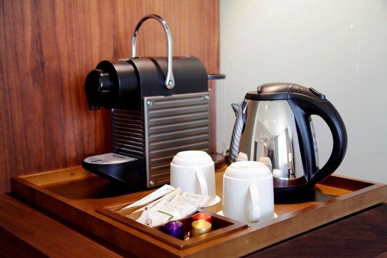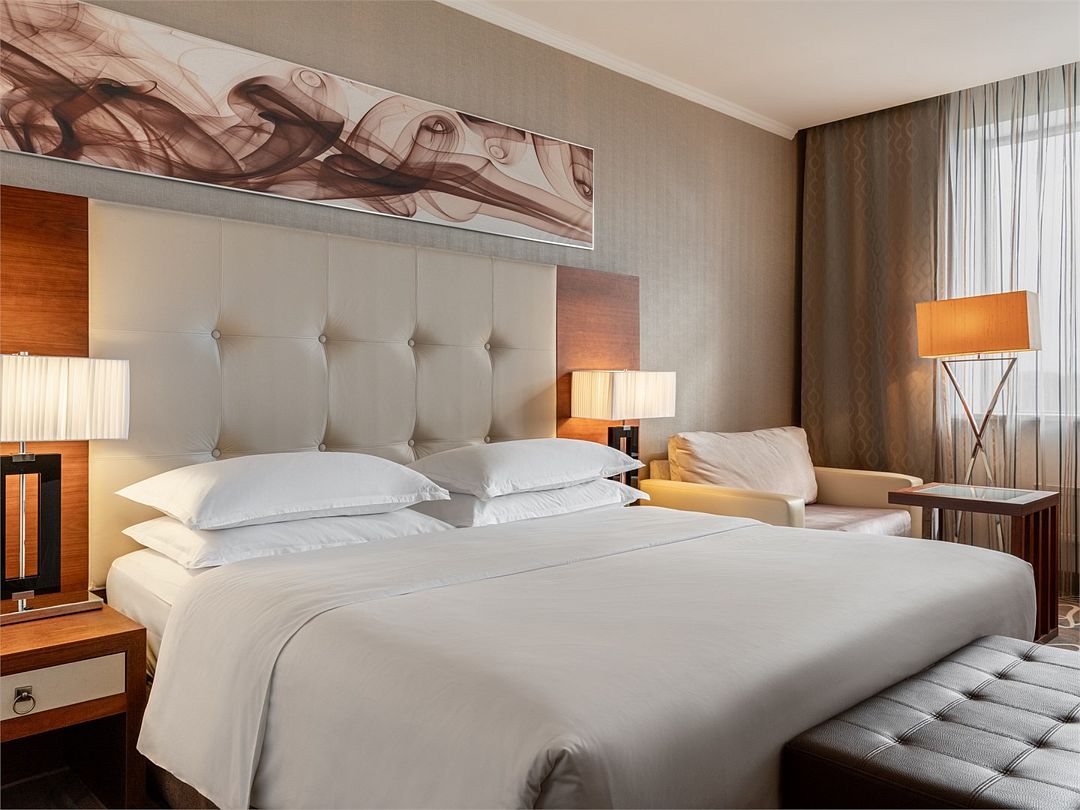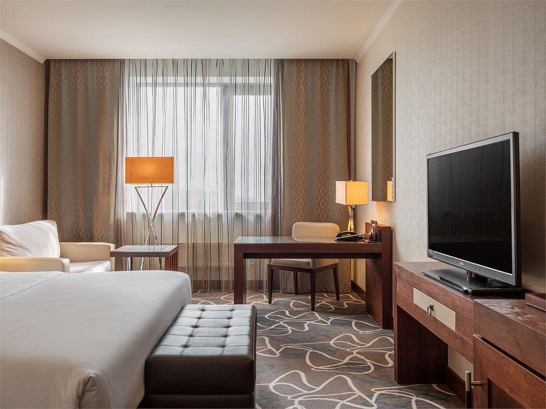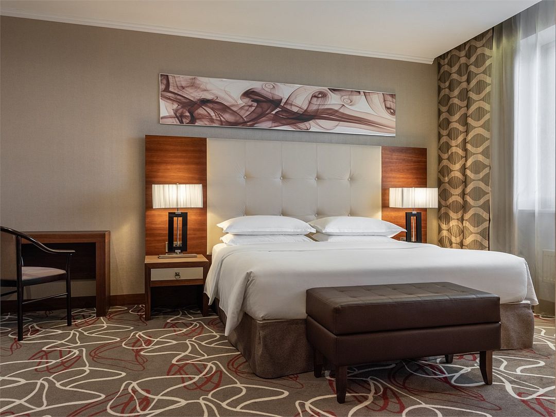 спутниковое телевидение, Wi-Fi, телефон, кондиционер, фен, электронные замки, кофемашина, утюг, ванна, банные принадлежности, халаты, тапочки, кровать «King size», гладильная доска, тумбы, шкаф для одежды, вешалки, журнальный столик, багажная тумба, зеркало, две комнаты, мини-бар, сейф, минеральная вода, чайник, раковина, косметическое зеркало, гостиная зона, ковровое покрытие, отопление, душ, кресло, стул, туалетные средства, туалет, диван-кровать, раскладной диван, телевизор с плоским экраном, гостиничная парфюмерия, номер для некурящих, рабочий стол, фитнес-зона, можно с питомцами, лежанка, мискаВ гостиничном номере