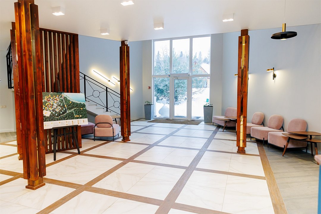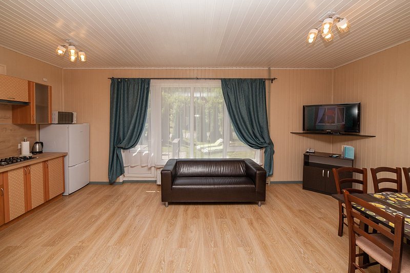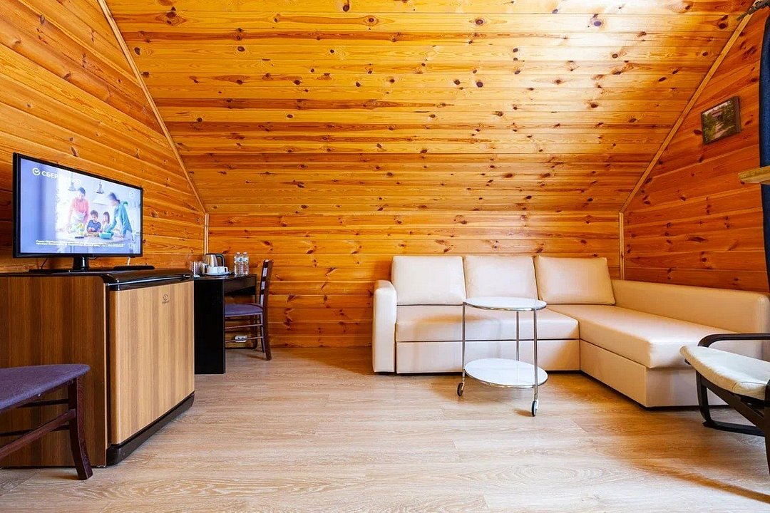 Зона гостиной оснащена мягкой мебелью (раздвижной диван), также из номера открывается прекрасный панорамный вид на территорию отеля и лес.