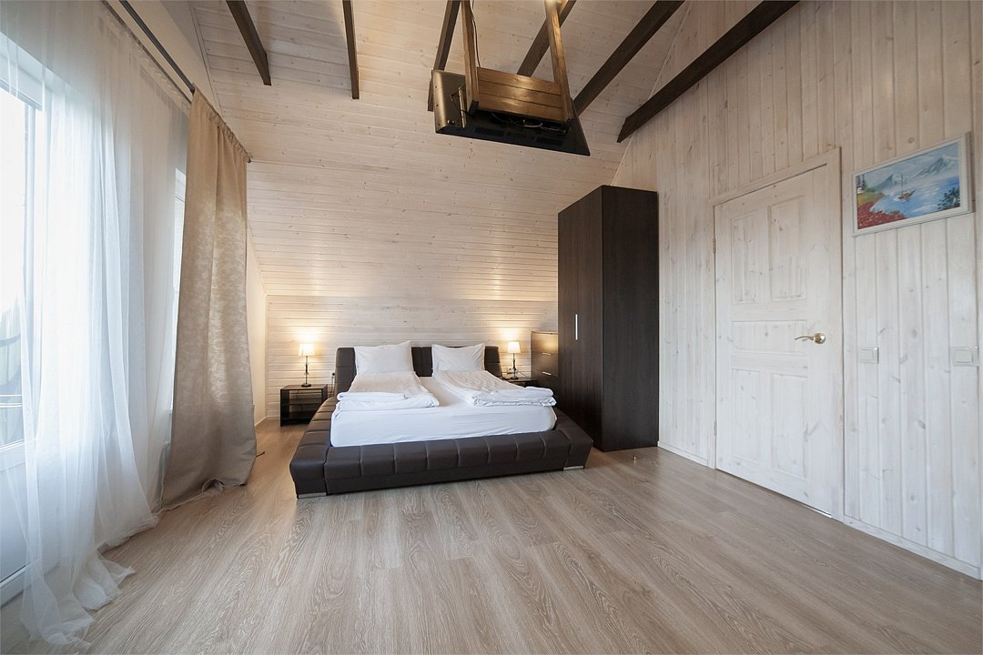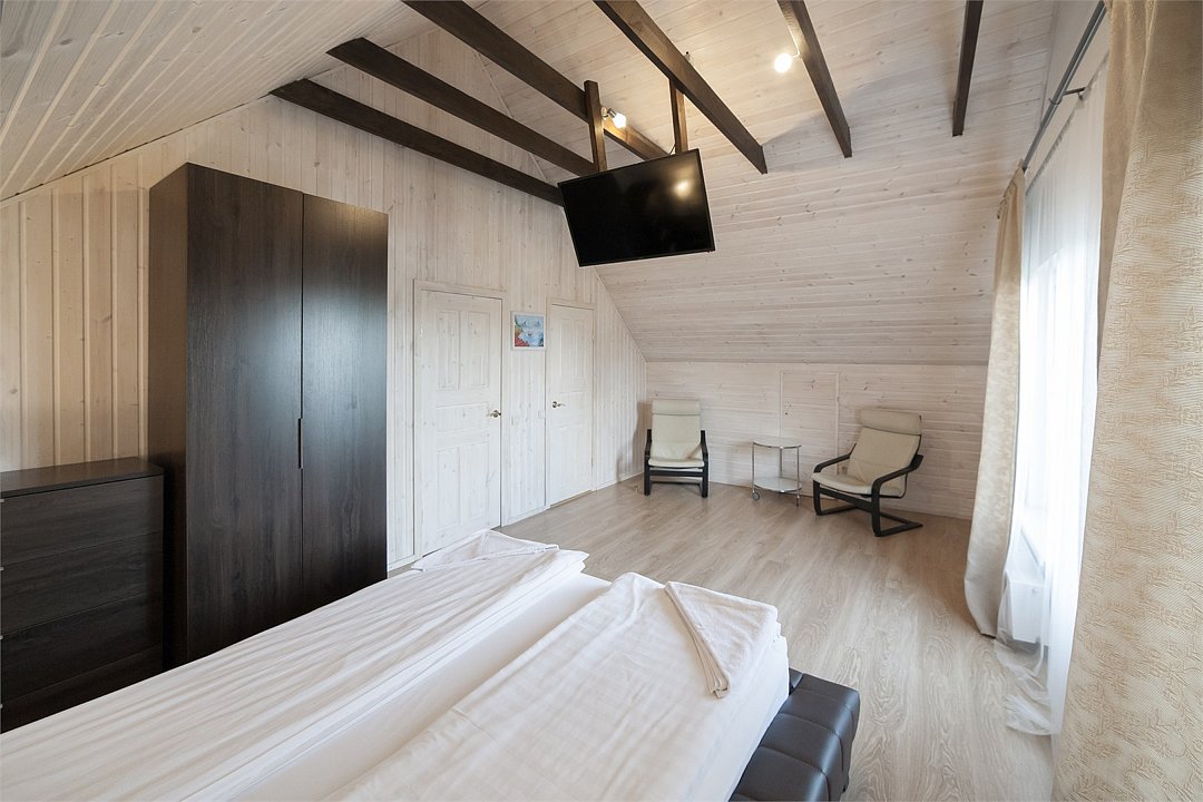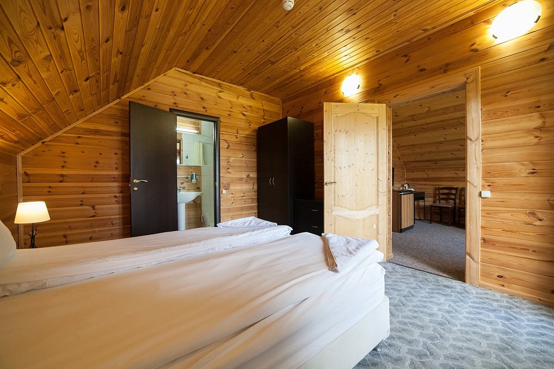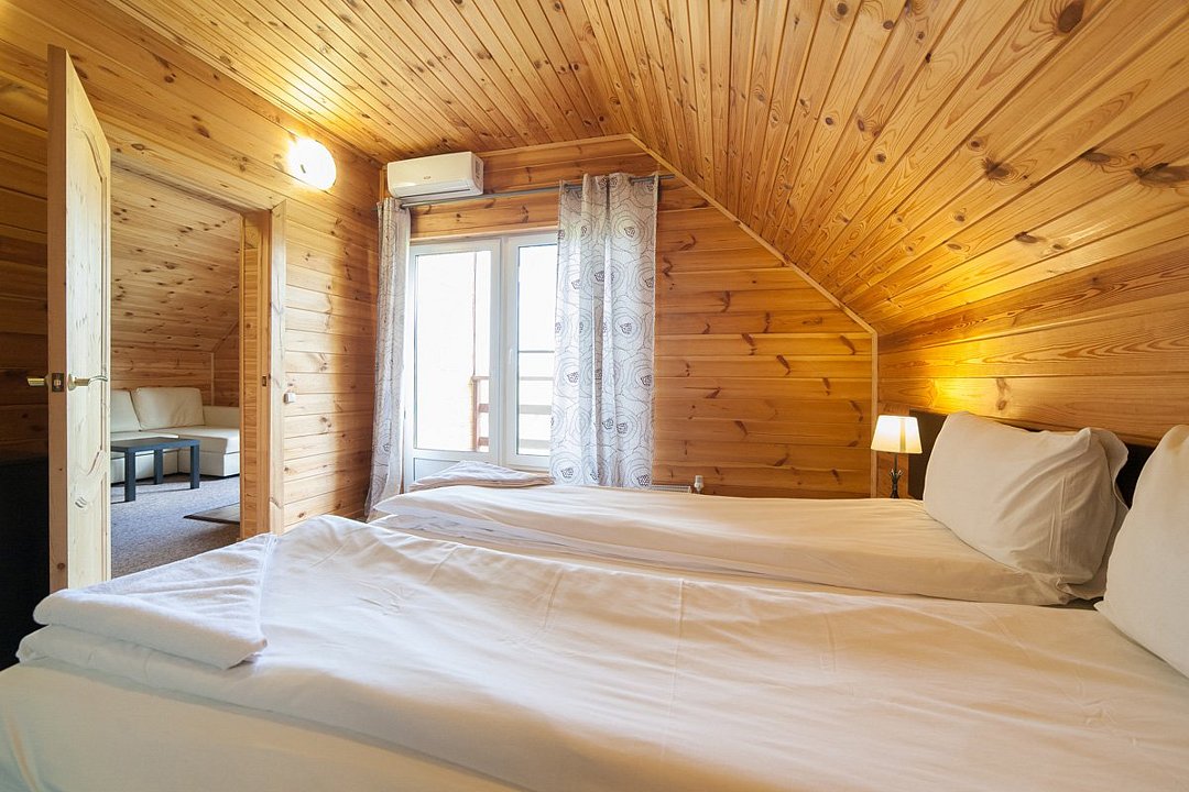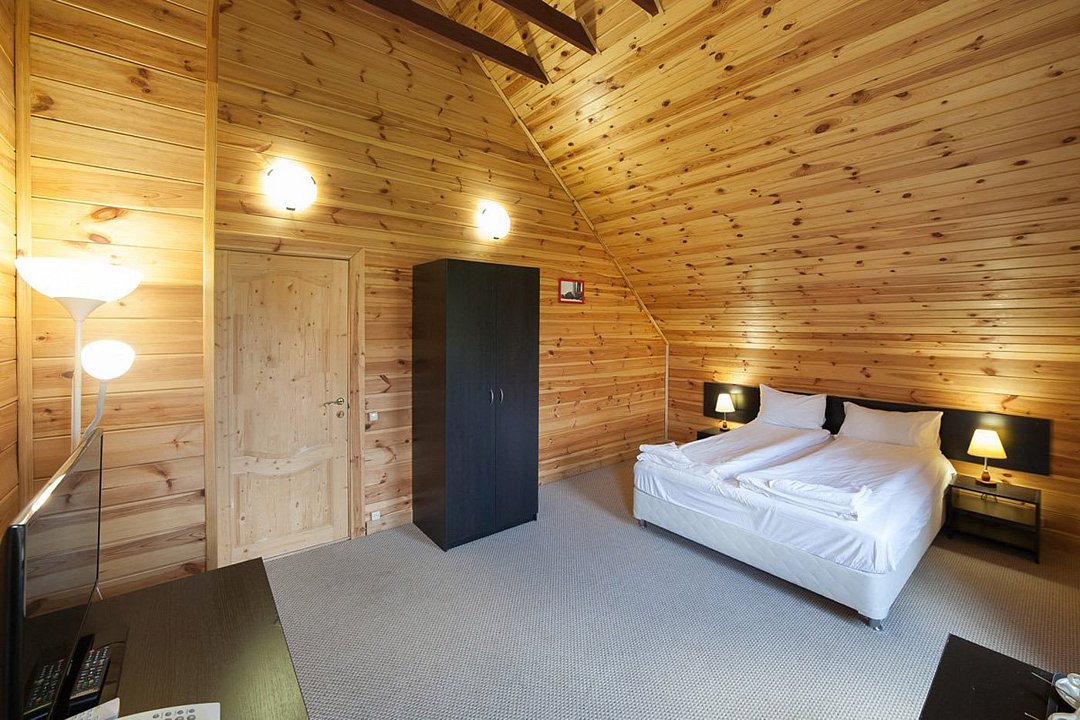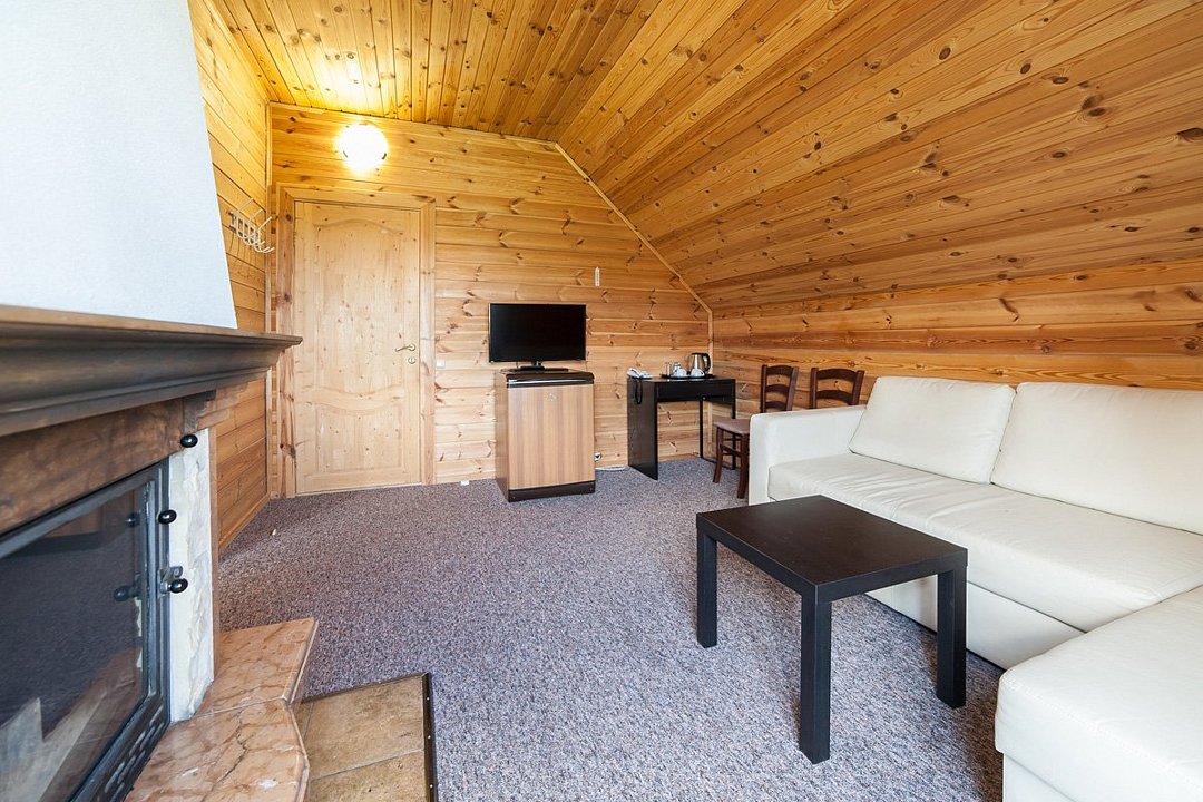 Номера категории Mansarda Luxe располагаются на вторых этажах гостиничных корпусов и состоят из 2-х комнат — спальни и гостиной. Камин является элементом декора номера и не является действующим.