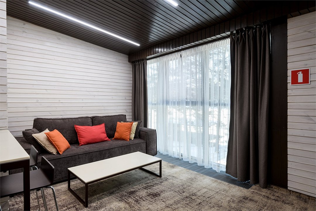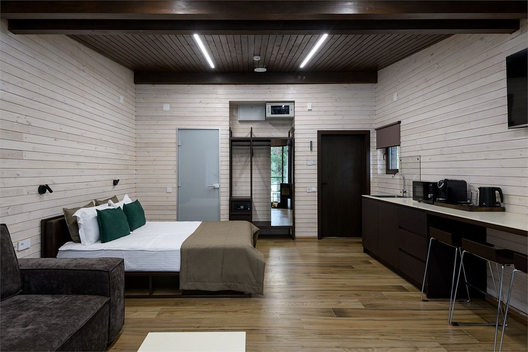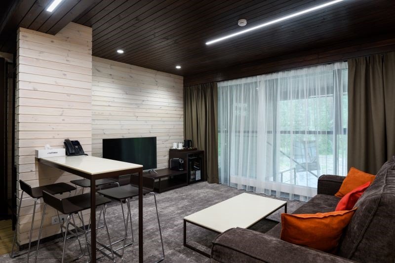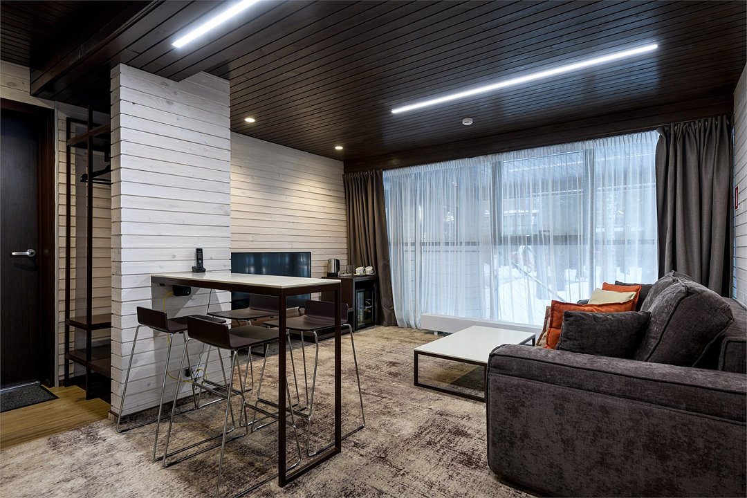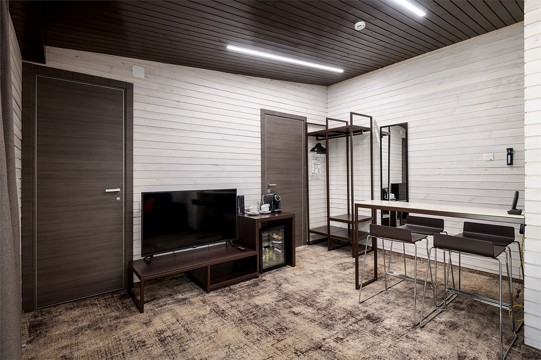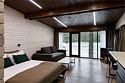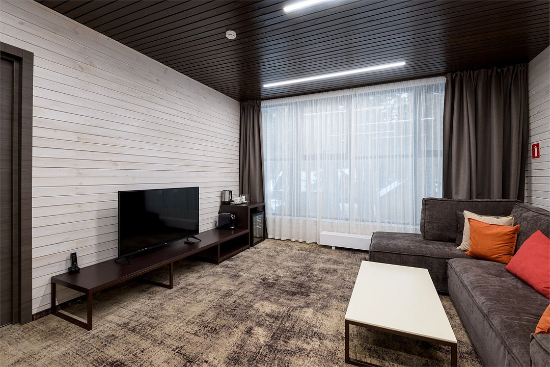 Номер расположен в основном корпусе эко-отеля на первом этаже. Одна из стен номера имеет панорамное остекление. Номер состоит из гостиной и спальни.