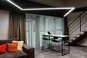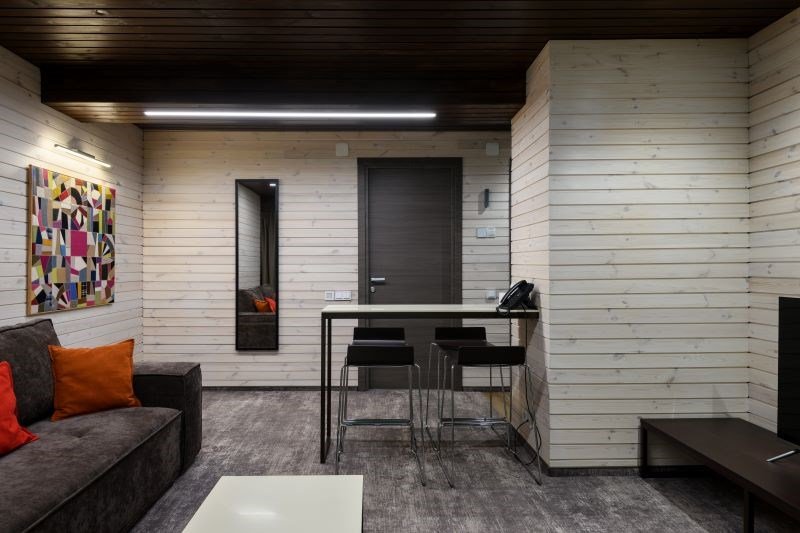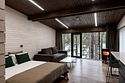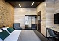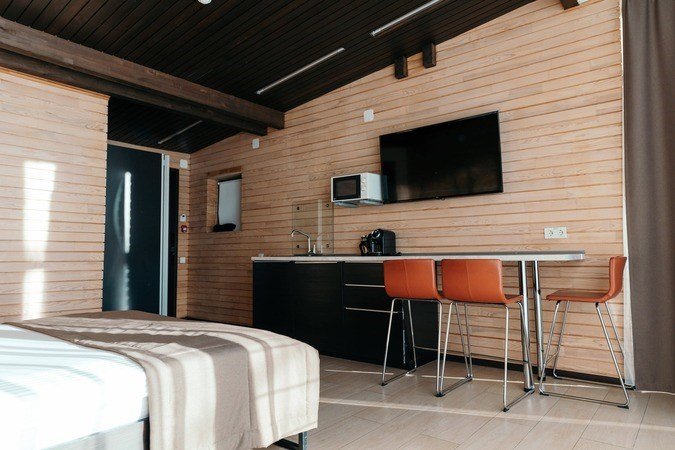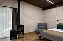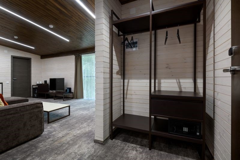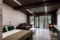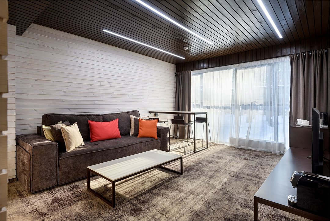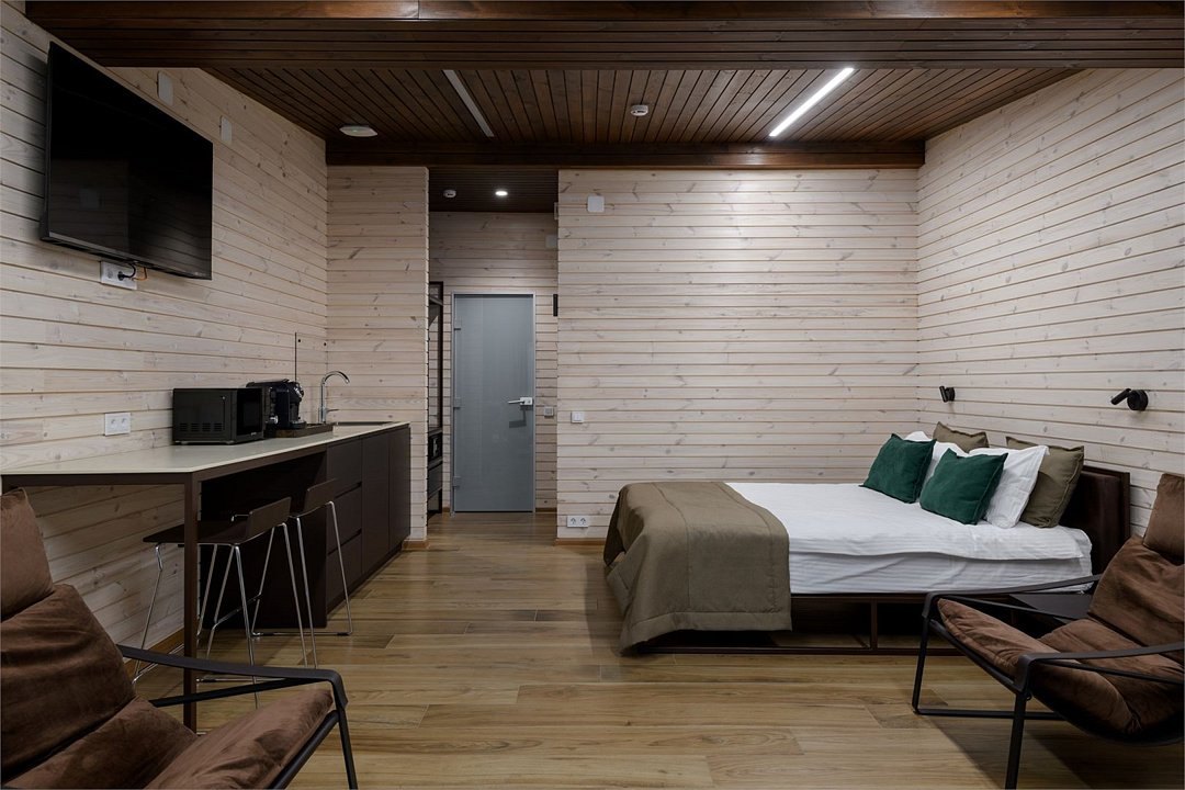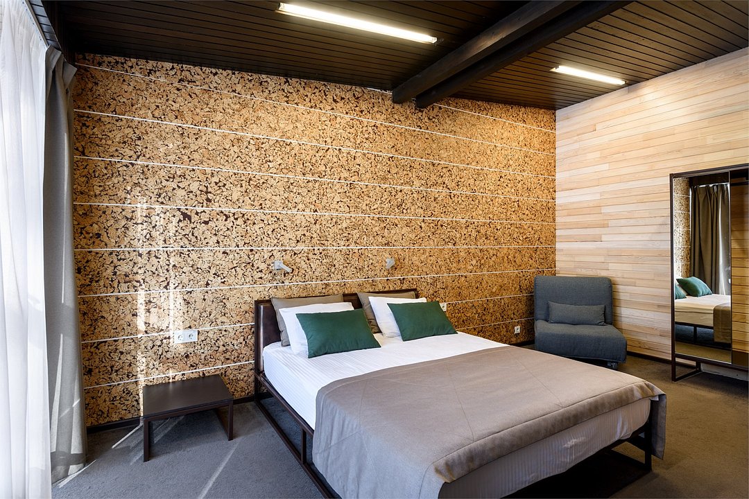 Номер расположен в основном корпусе эко-отеля на первом этаже. Одна из стен номера имеет панорамное остекление. Номер состоит из гостиной и спальни.