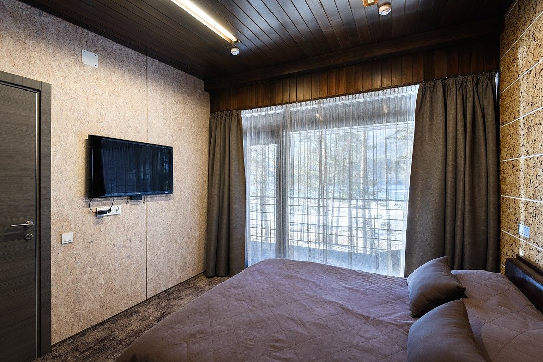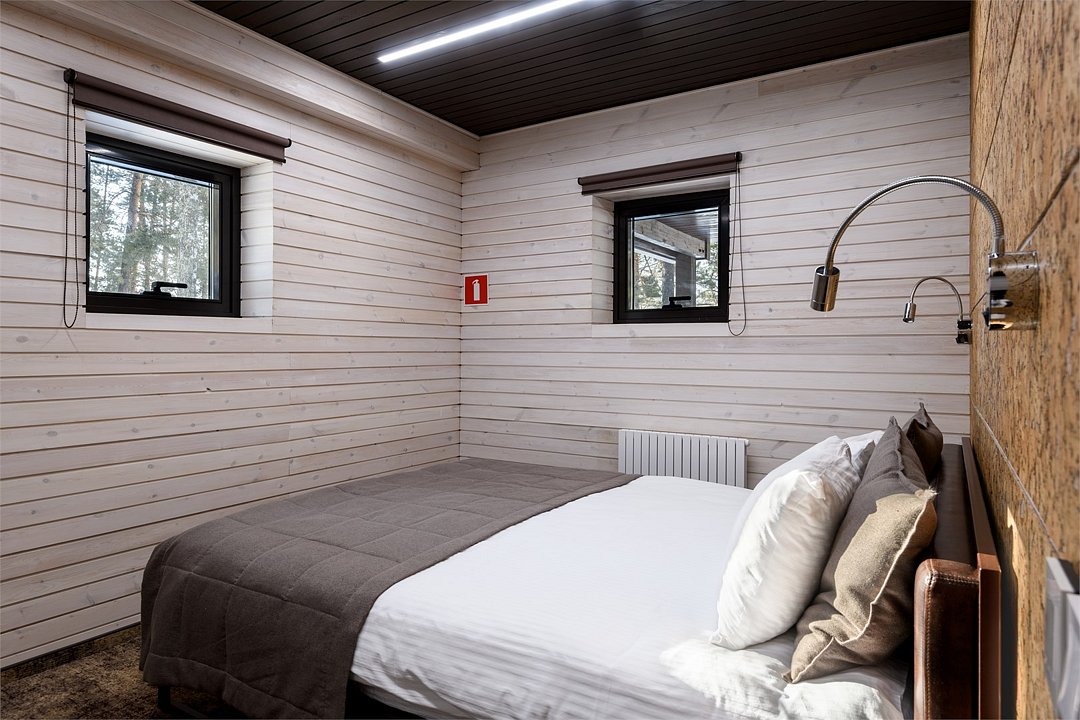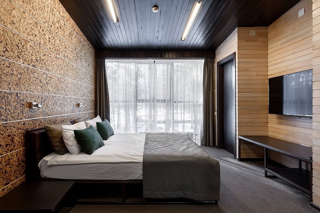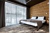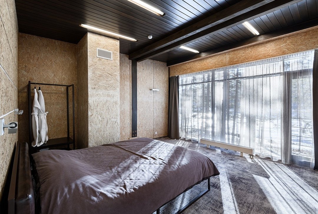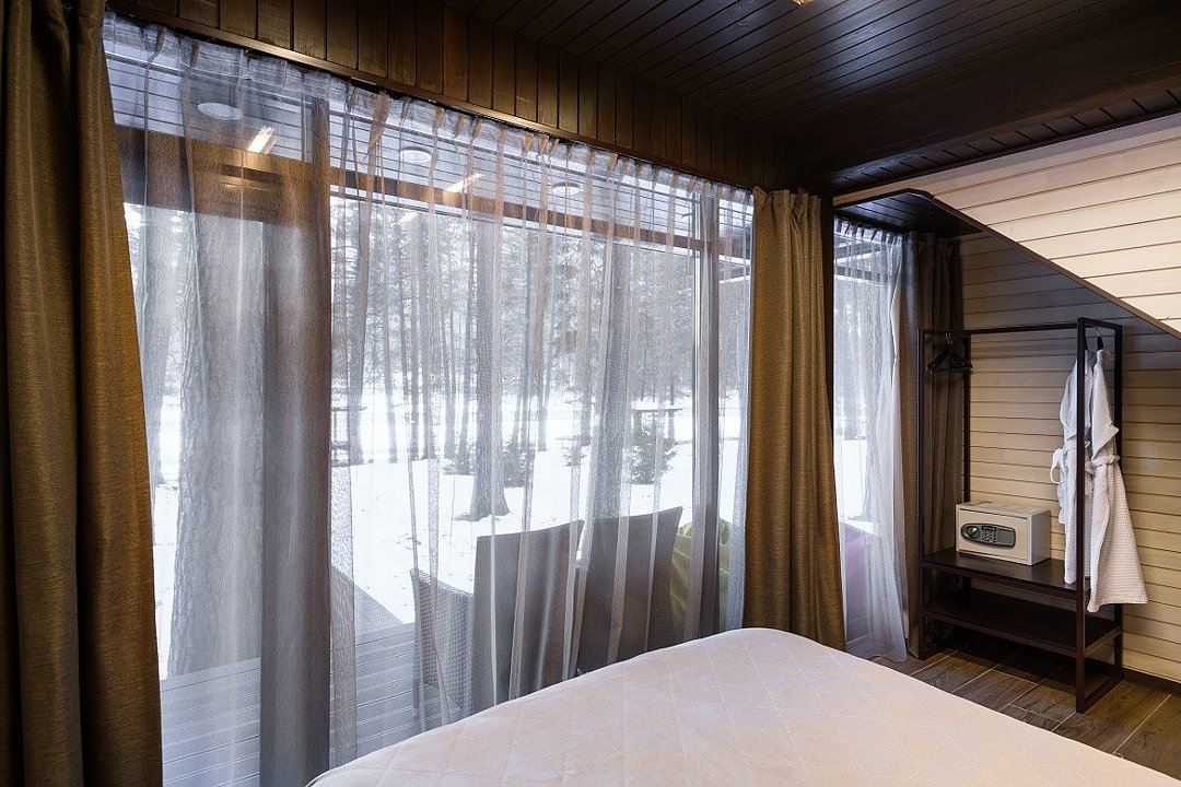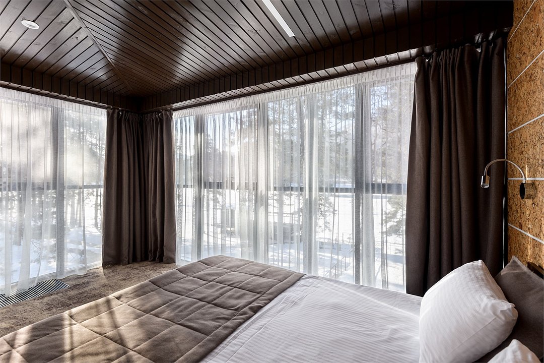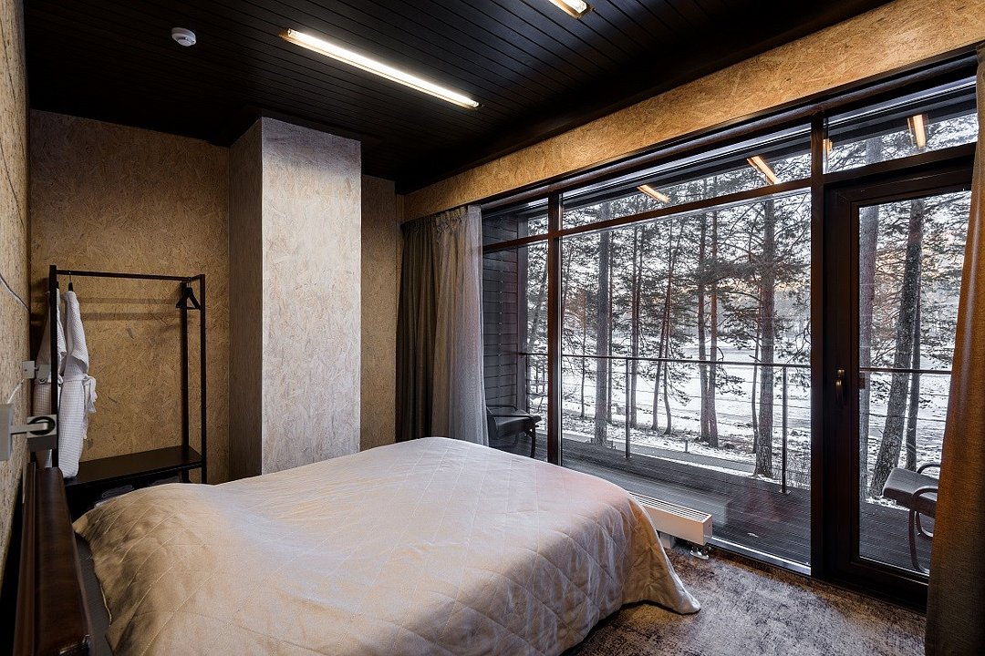 Номер расположен в основном корпусе эко-отеля на втором этаже. И гостиная и спальня имеет панорамное остекление.